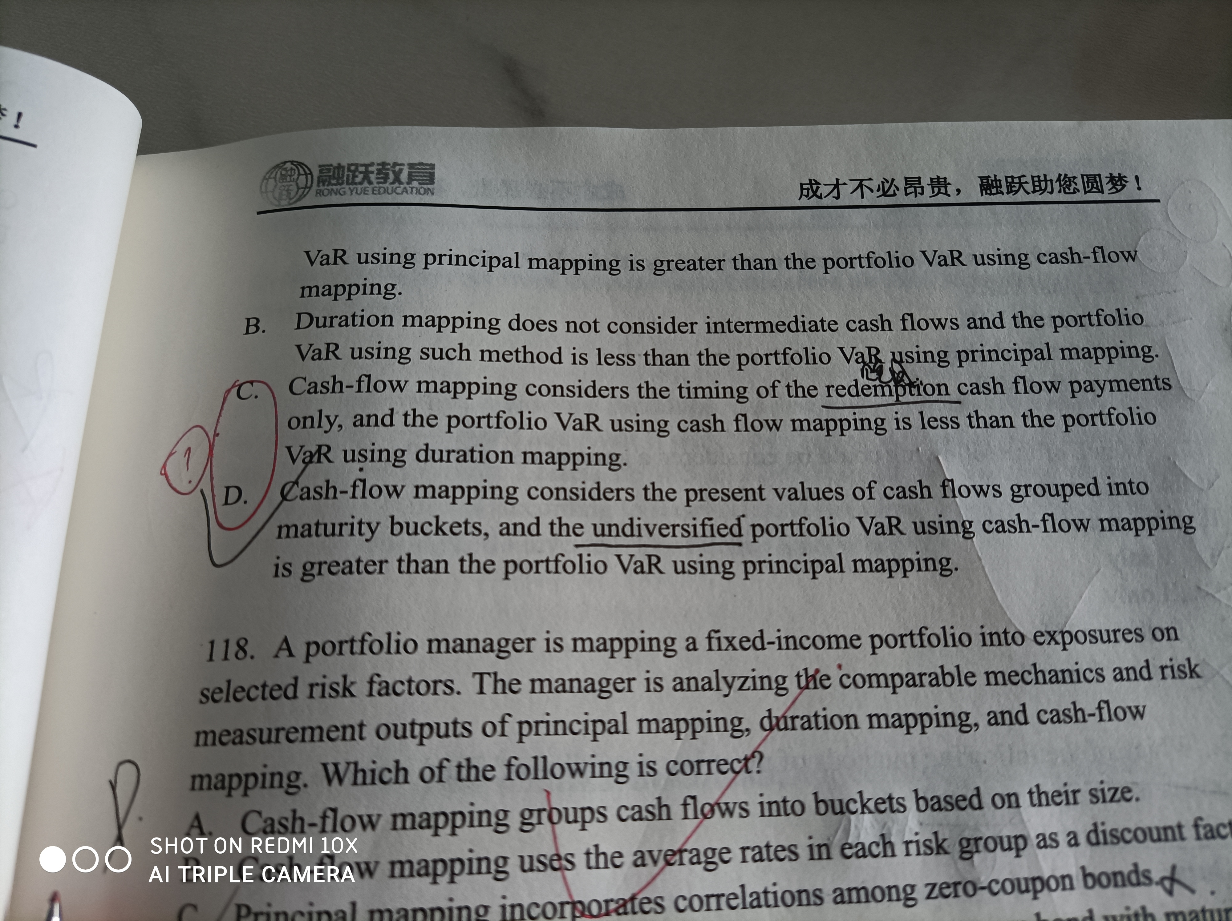 C选项中现金流量映射只考虑偿还现金流支付的时间的描述错误,现金流量映射将债券的风险分解为债券各个现金流的风险,不是只考虑偿还现金流支付的时间;D选项错误,因为使用现金流映射的单一投资组合VaR小于使用本金映射的投资组合VaR