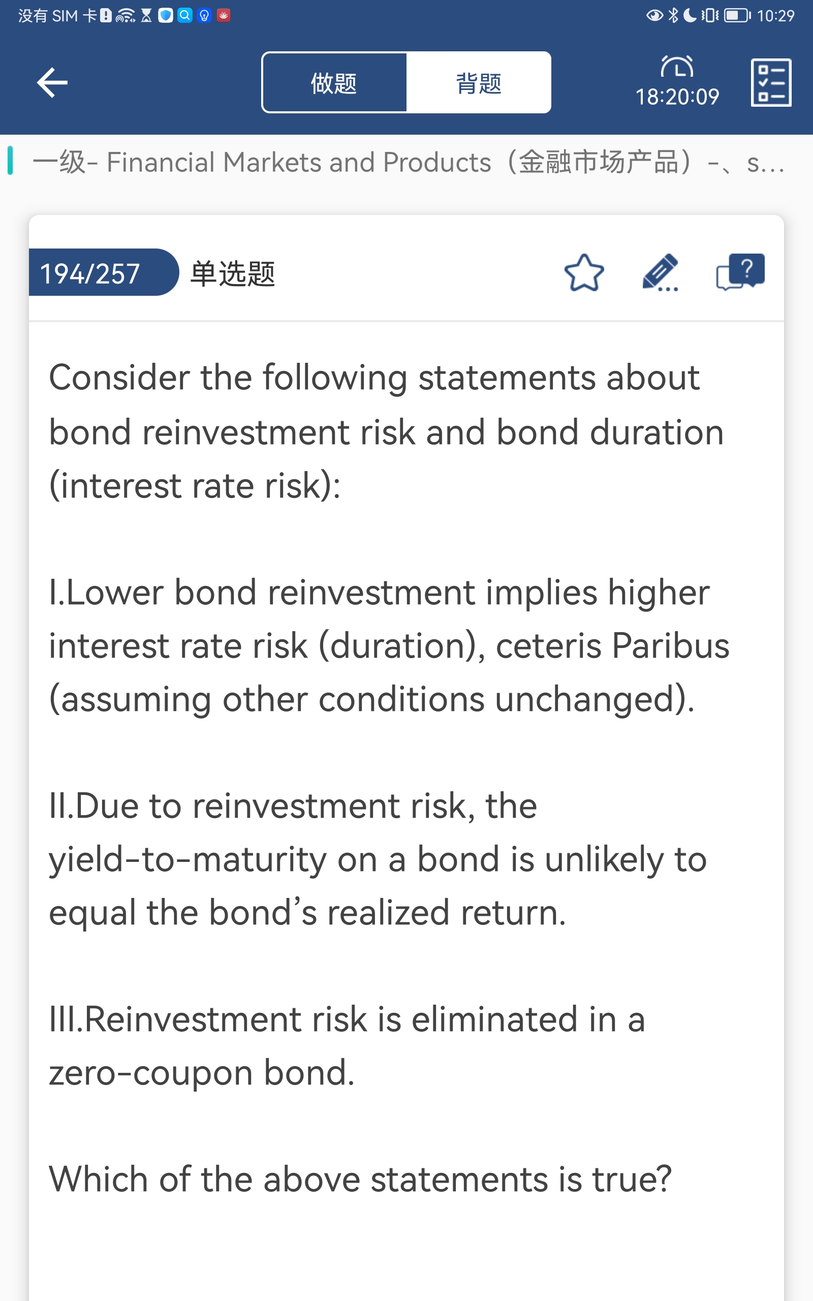 同学,零息投资消除了再投资风险,因为没有息票可以再投资,所以没有再投资风险。当然,尽管这在利率下降的市场中是有益的,但当利率上升时,情况就相反了。投资者将无法以不断上升的再投资利率对收入流进行再投资。利率越低,它们再次上升的可能性就越大,从而使零息投资在潜在持有人眼中的价值降低。但是零息债面临利率风险,利率风险和再投资风险是相对应的哈