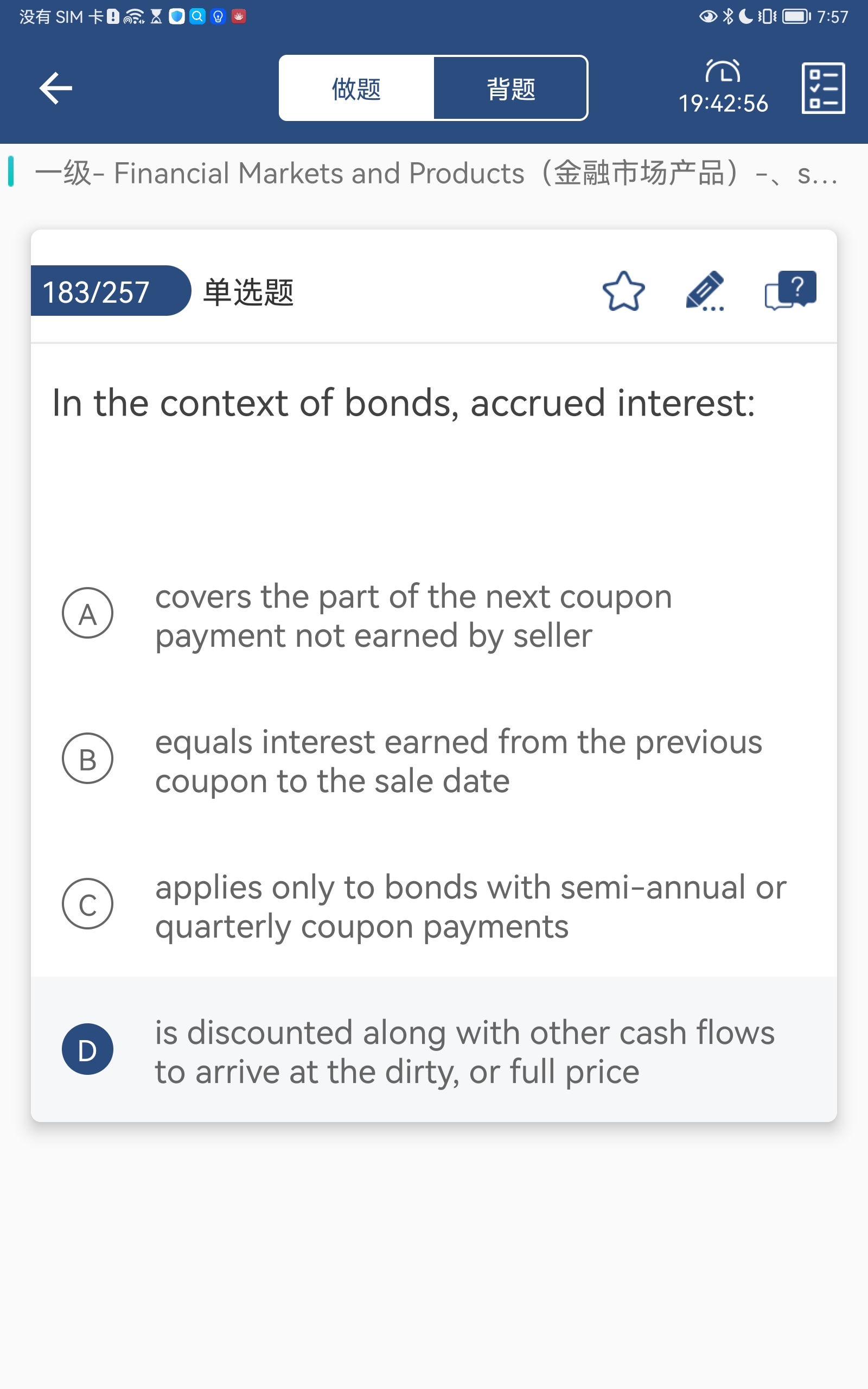 同学,D选项意思是是与其他现金流一起贴现以达到全价,是错误的哈,我们对于AI的计算是单独拎出来计算的哈