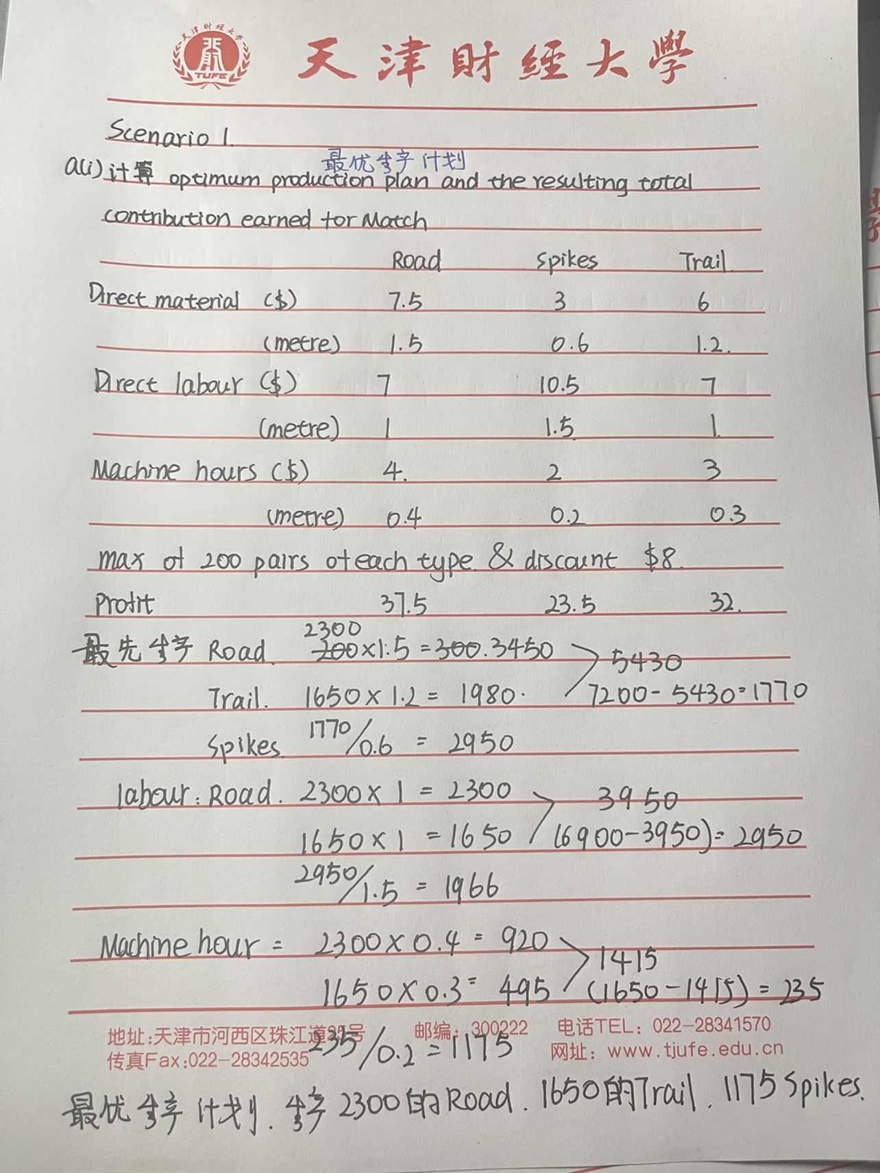 同学,a(i) 这道题目是考察有限制性因素的决策,所以不能使用profit直接排序,需要先识别哪个是限制性因素,在使用contribution per 限制性因素来排序,建议看一下答案。a(ii) 会有罚款是是否接了特殊订单后能否完成,那么我们算出在限制性因素的影响下先完成特殊订单的contribution和后完成特殊订单的contribution差额, 就是我们能接受的最大罚款,不然就不接特殊订单了,罚款比赚的contribution多,公司肯定不愿意。