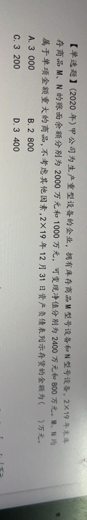 你好,答案是2800,M 产品按照2000,N 产品按照800 ,按照孰低法计量。