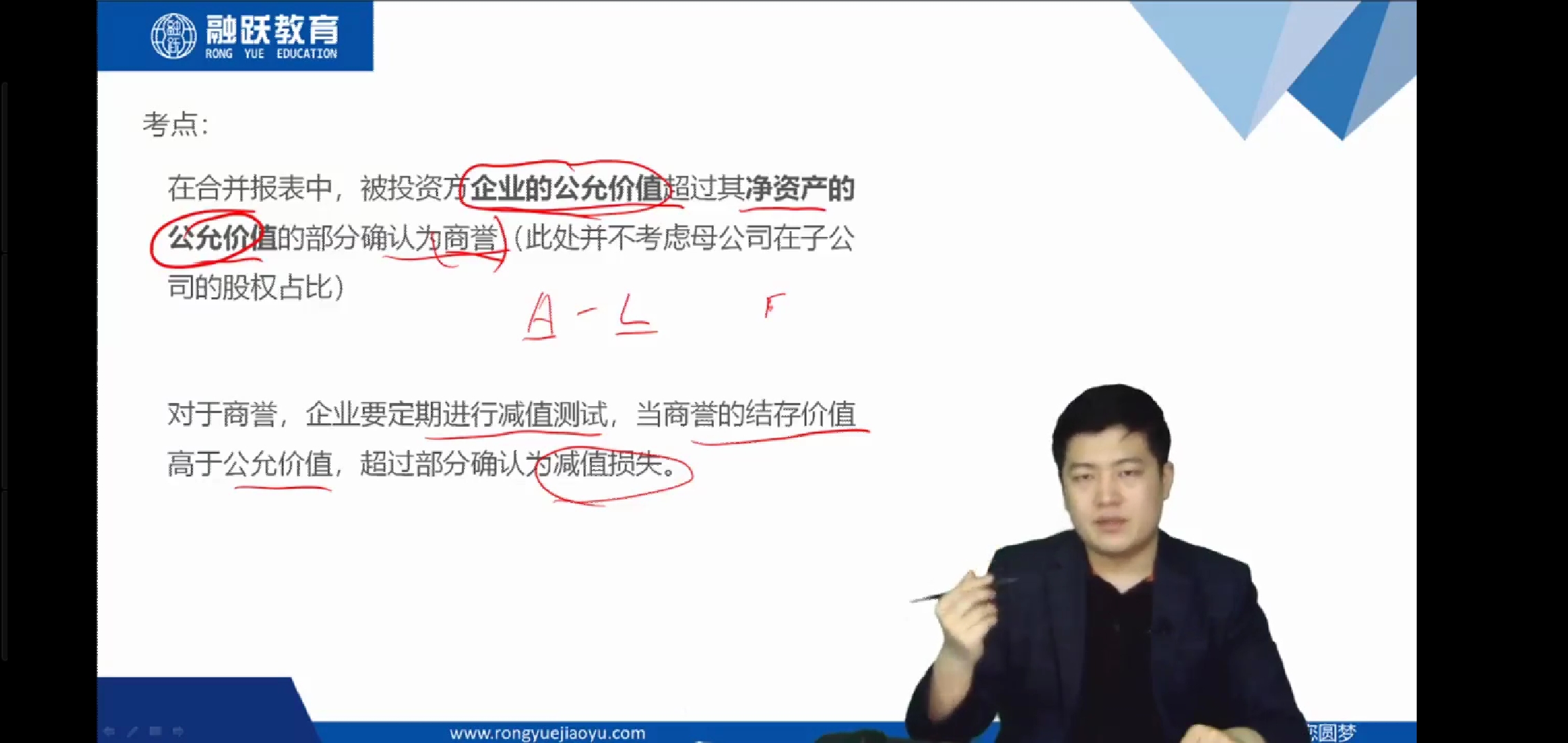 (1)公允价值是指市场参与者在计量日发生的有序交易中,出售一项资产所能收到或者转移一项负债所需支付的价格。企业的公允价值通俗的讲就是某项资产在某一时点上的公认价值,是熟悉该项资产的人,都能认同或接受的价值。一般情况下,这个价值的取得,是要有该资产活跃的交易市场。 (2)商誉实质上就是指支付的收购成本超过所取得的被收购方资产净值部分的价值。比如:A公司要收购B公司,B公司的净资产为50万元,但A公司愿意支付60万元购买(其实就是公允价值),多出的10万元就是商誉。 (3)这句话中,商誉的结存价值也就是账面价值,公允价值是市场认可价值,当账面价值大于市场认可价值时需要计提减值准备,所以记损失。比如:第二个问题中的例子,此时在收购时商誉是10万元,但是在收购次年的资产负债表日发现B公司公允价值变为55万元,比60万少5万,假设此5万元全部是商誉减值,那商誉的市场价值就变为5万元,但在收购时商誉账面已记载10万元,所以需要计提减值准备5万元。