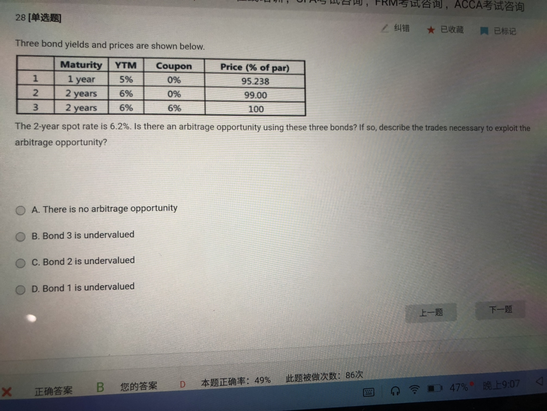 但是题目没有bond3 被高估的选项啊。在已有的选项中,选出最优的。通过1和2 构造出3的现金流,未来的现金流相同的时候,现在的价格也应该是相同的,用这样的思路来解题。