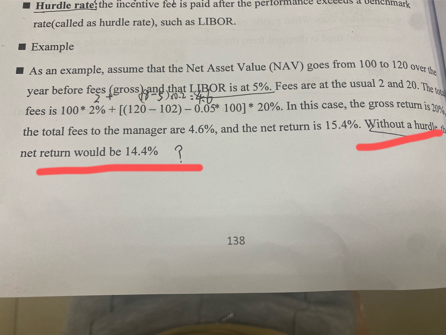 同学你好,这句话的意思是说,在不考虑hurdle rate (=5%)的情况下,对冲基金的net return=总收益(20)-总费用[100*2%+(120-102)*20%=5.6]=14.4,然后再除以初始投资资金100,就等于14.4%