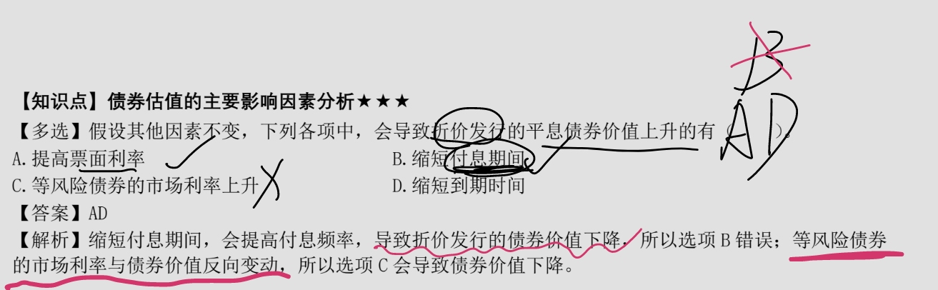 同学您好 折价发行的债券,债券持有人以低于面值的金额购入此债券,而债务人相当于亏了,那么该债券的利息率将会低于折现率(比如说市面上其他债券的票面利率是10%,那么折价发行的债券会低于10%),债券持有人少花了钱购入债券,在利息上就会获得较少,本金和利息是此消彼长的关系; 付息频率增加,利息增加的现值比本金下降的金额多,债券整体价值会下降。