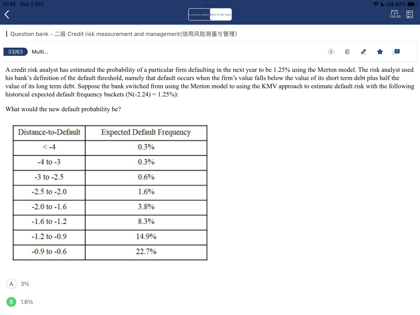 同学,根据KMV模型的解题思路,题干中给出的条件,1.25%的莫顿模型违约概率就对应着-2.24的d2,再根据这个d2去kmv表格中找到对应1.6%的违约概率哈
