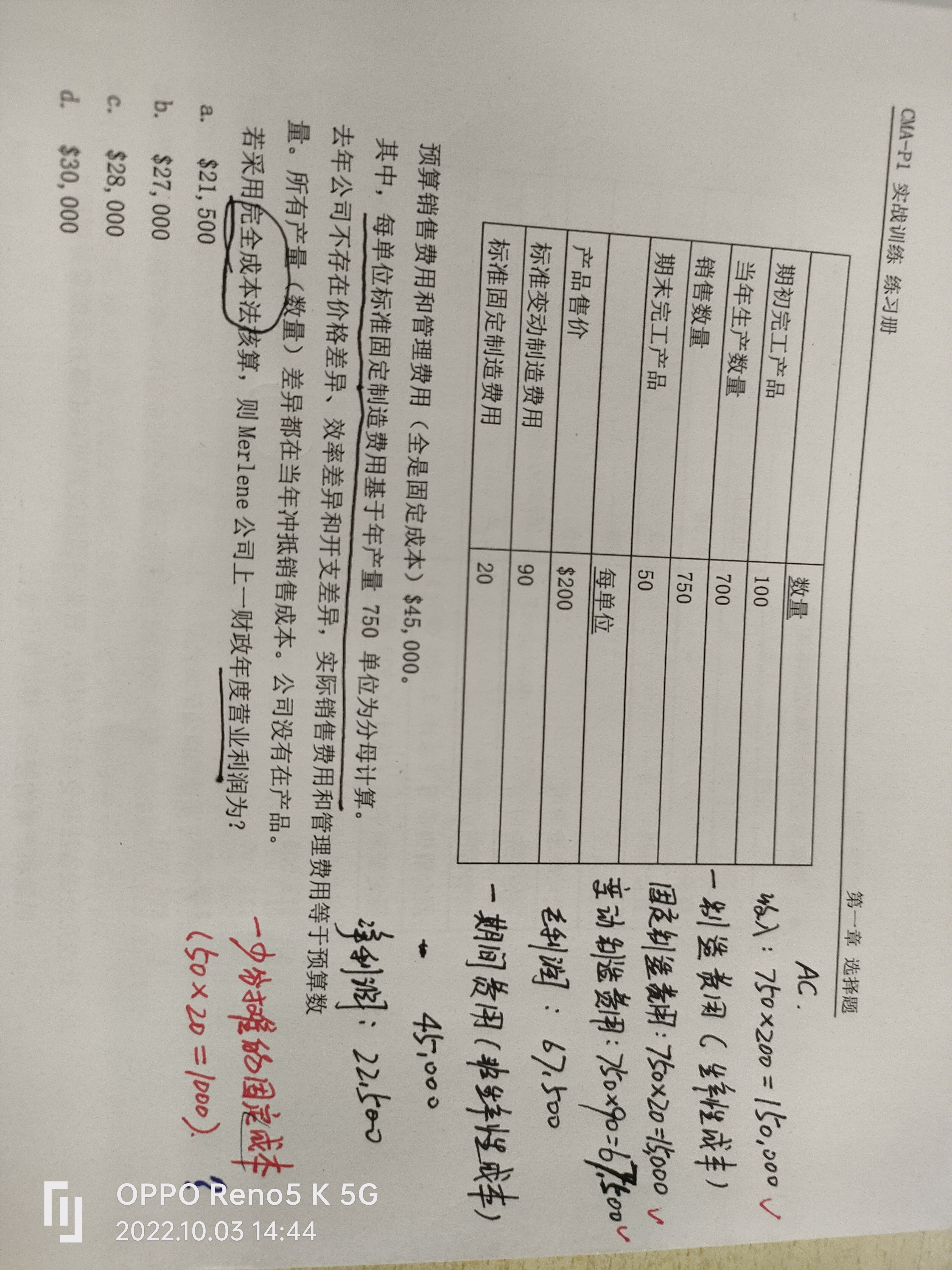 同学你好,在吸收成本法下,所有的制造成本首先被”吸收“在存货中,这些存货成本会随着商品被销售流转为产品销售成本。题干中,本期生产700单位产品所发生的固定制造费用=750*20=15000美元,本期实际销售750单位,也就是说使用期初存货50单位,这个费用=50*20=1000美元。