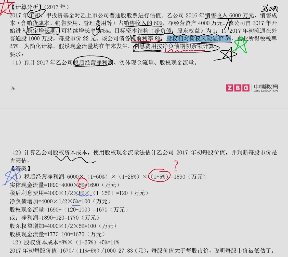 同学你好,这个股权相对债权风险溢价5%,可以理解为股票的风险高于债权,投资股票要获得的风险收益高于债权。要高5%。即要多获得5% 的收益,计算实体价值,可以套用实体价值计算公式来理解。谢谢您,学习辛苦了。
