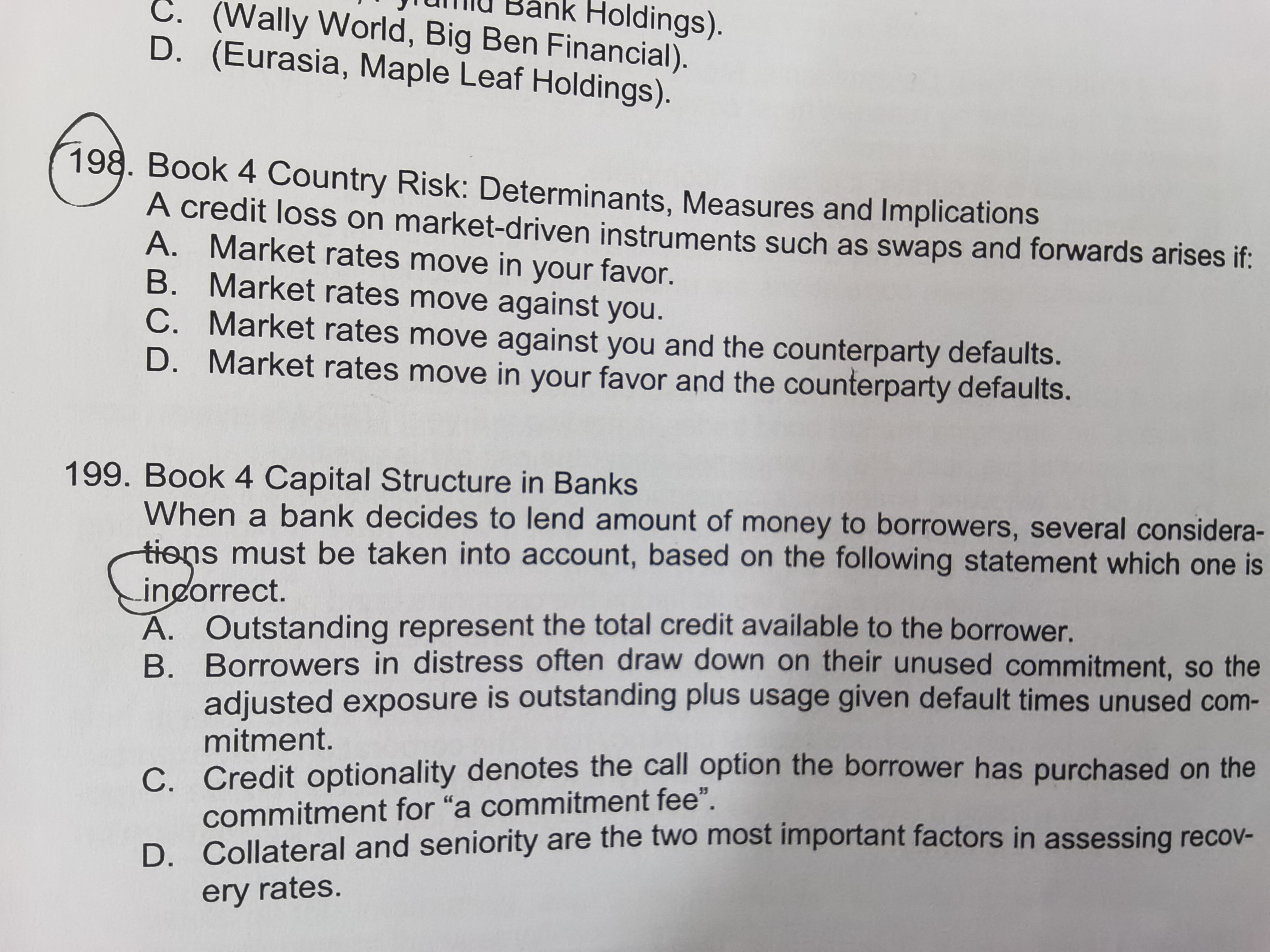 同学,198题目是考查我们在什么情况下会产生信用损失,我们根据对市场的预期从而与交易对手方达成交易,如果市场运行与我们预期一致,那么就会产生盈利,但如果交易对手方违约,那么就会产生损失;199考察银行在放贷的时候应该核查借款人的什么信息,比如说借款人的信用质量,抵押品的数量和质量等等哈