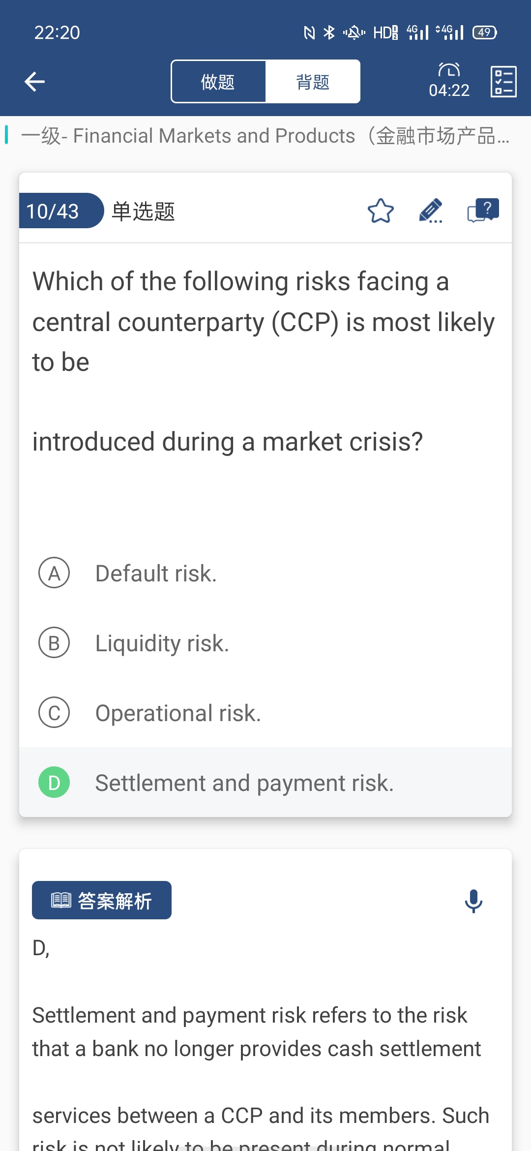 题干问的是市场危机期间,中央对手方(CCP)面临的以下哪种风险最有可能出现,结算和支付风险是指不再在CCP及其成员之间提供现金结算服务的风险。这种风险在正常时期不太可能出现,但在危机时期更可能出现。选项中其他风险在正常和危机时期都存在。例如,流动性和违约风险始终存在,但在危机期间会加剧。正常时期也可能存在导致业务中断的信息系统不足等操作风险。