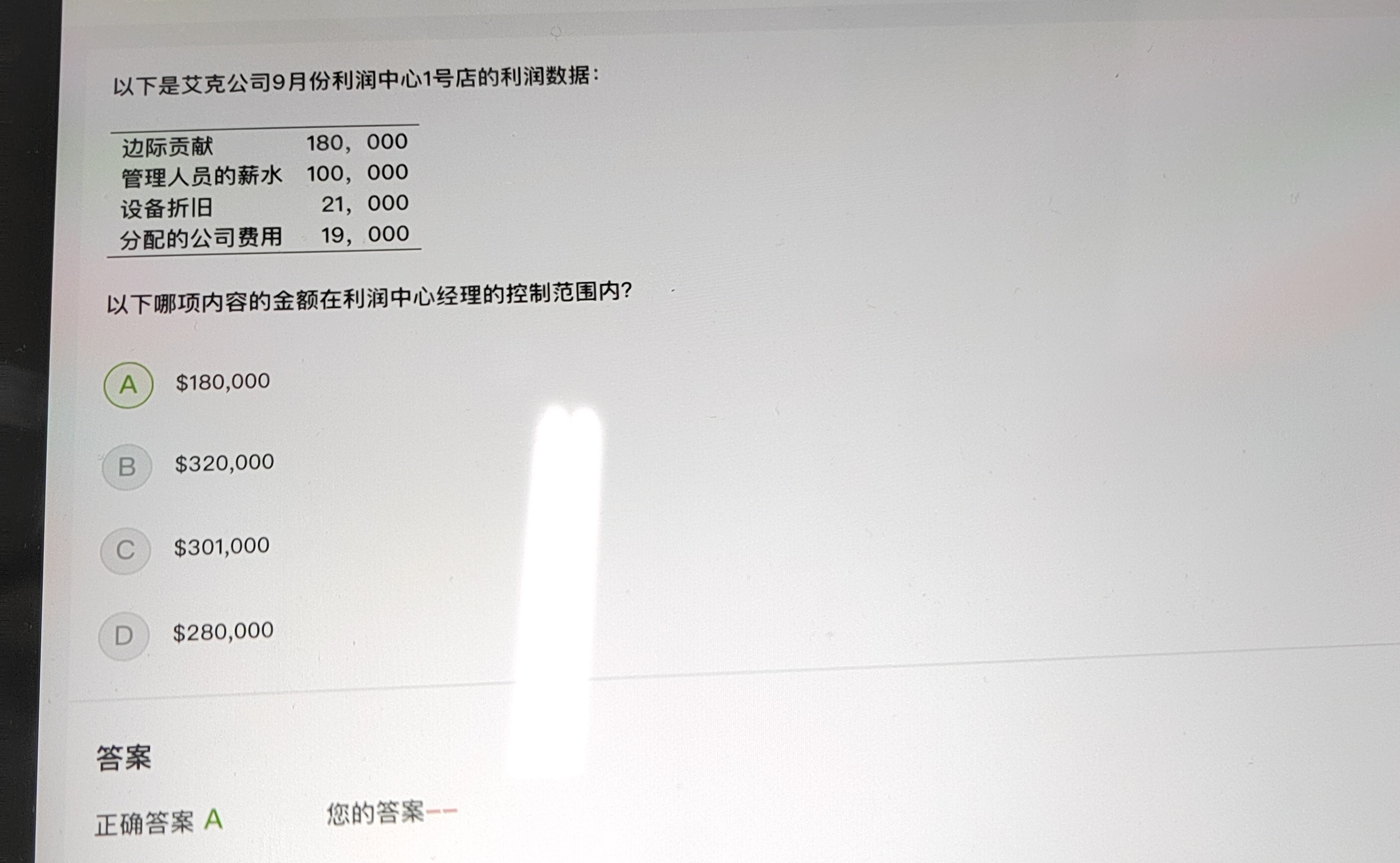 同学你好,利润中心负责收入和成本,利润中心的管理者有责任创造利润、管理收入和控制成本,也就是我们常说的部门可控边际贡献=边际贡献-部门可控的固定成本。关于这个成本需要是利润中心经理能够控制的成本哦,选项中的其余三项:管理人员的薪水、设备的折旧、分配的公司费用都不是部门经理能够控制的。