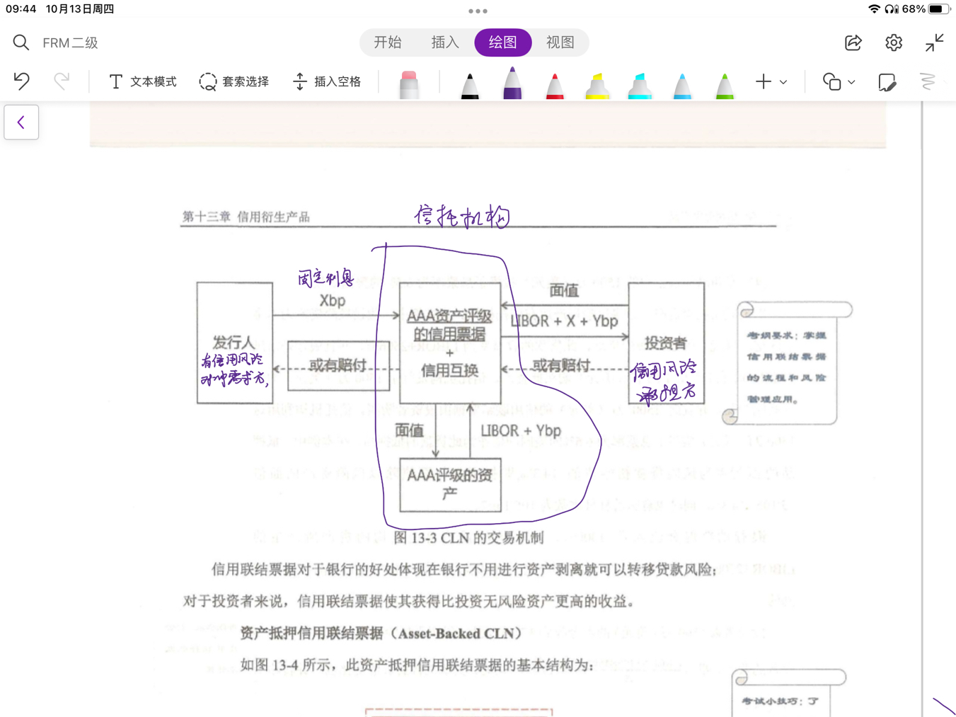 不用客气呀同学,我们来捋一遍CLN哈。银行对于自己放出去的贷款会进行风险管理,比如说实现true sale打包卖给SPV形成资产证券化,但是对于一些核心贷款是不能直接卖出去的,那么就需要其他方式是操作,比较常见的手段是银行找到一个交易对手方买CDS,也就对应这图表最左边的(贷款)发行人,从中间trust那里购买CDS,支付Xbp的CDS premium,对应的可以得到来自CDS卖方的或有赔付,图表中用虚线表示了。接下来分析中间的trust,也就是卖出CDS保护的一方,trust当然也不想承担这些风险,会想办法将这些风险再转移出去,最好是再形成一个风险资产能够打包卖给投资者,这时候就用到我们在学习CDS产品时的一个公式:risky bond+CDS=risk free bond,一个风险资产加上一个CDS就可以构成一个无风险资产,现在trust手中相当于卖出了CDS,并且想构成风险资产,那么根据等式的移项risky bond=risk free bond - CDS,现在trust只需要买一个无风险资产就可以构成风险资产了,也就对应着图像中的AAA资产,发行CLN卖给投资者。买无风险资产的本金哪里来呢,用的是投资者购买CLN产品的par,发给投资者的收益也就是无风险收益加上卖出CDS的premium,对应着图表右边投资者的收入和支出。