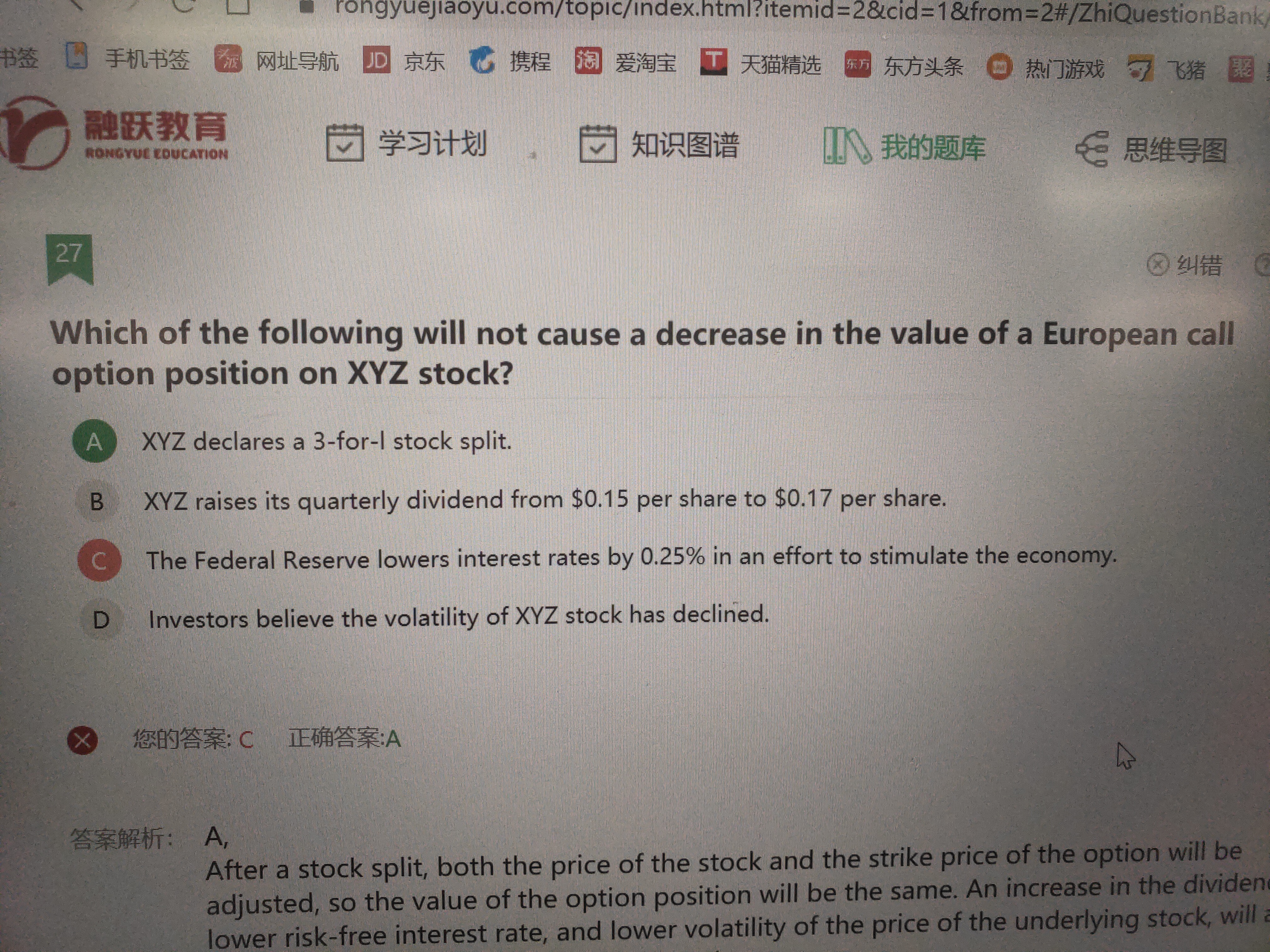 利率和波动率与看涨期权价值呈正相关,所以cd的描述都会降低以XYZ股票为标的的欧式看涨期权的价值,不符题意