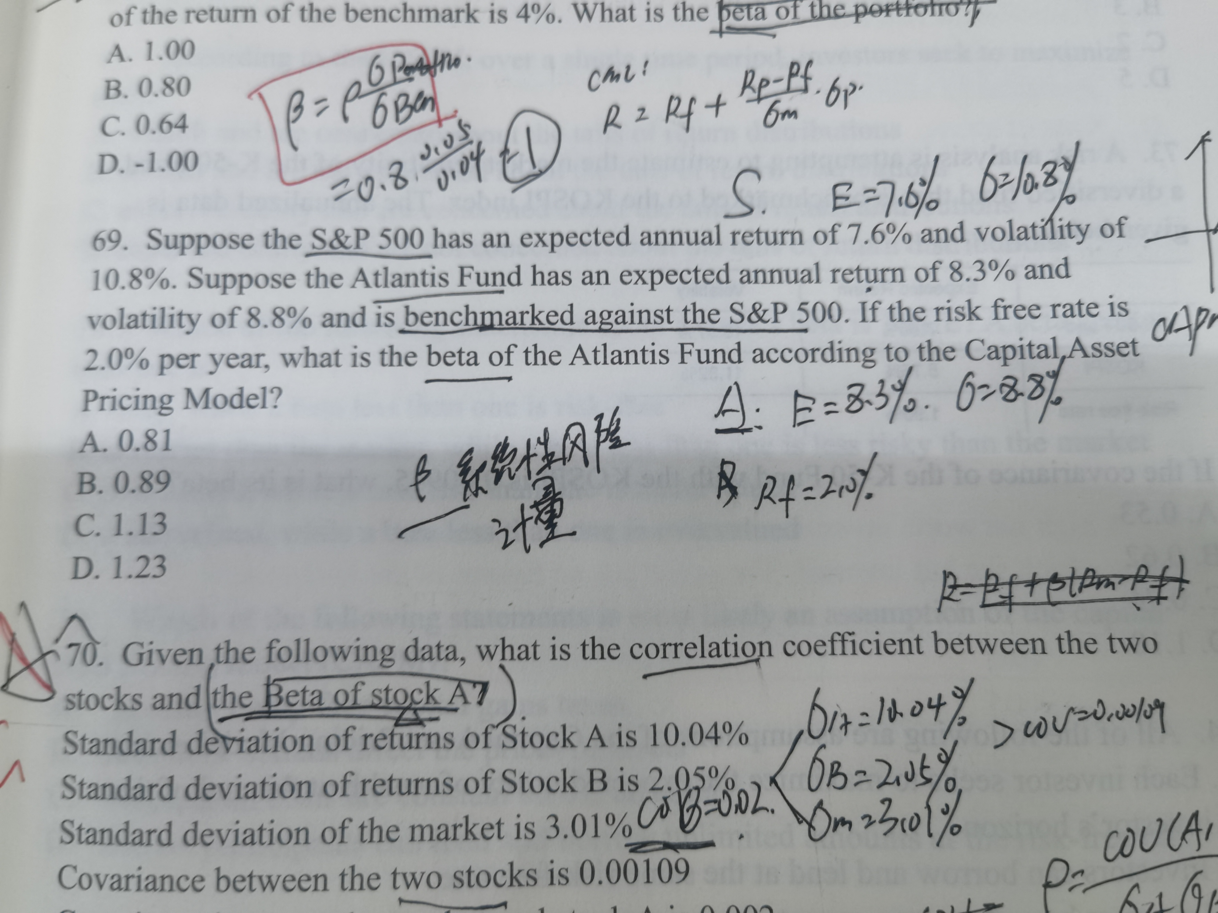 同学,这个题目考查我们beta的计算,但是直接根据beta的计算公式是计算不出来的,根据题干中给出的数据,我们发现根据CAPM公式是可以倒推出beta的哈