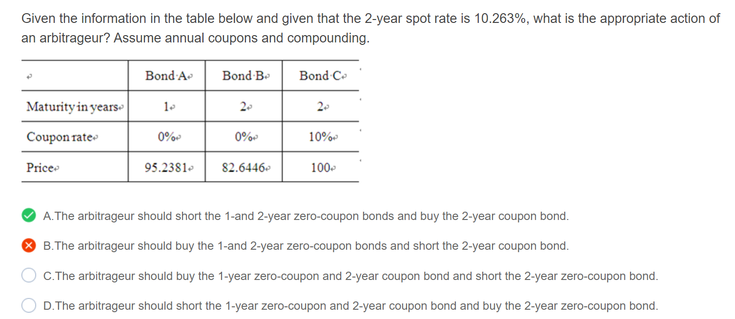要确定2年期零息债券是否存在定价错误,先使用财务计算器计算其收益率。使用年复利FV=100;PV=-82.6446,N=2;CPT I/Y=10.00%。由于其收益率太低(与10.263%的即期利率相比),这意味着其价格太高。因此,我们将做空这个零息债券,并购买2年期息票债券。我们还将做空1年期零息债券,因为其本金偿还可以用息票债券上的第一年息票支付。这个题目的考查只考查了套利策略,如果进一步要求我们计算套利收益的话,以下计算提供了套利利润,假设购买了1000000美元的息票债券。1年期零息票债券将以对应于息票债券第一年息票的金额进行卖空,即10%×1000000美元=100000美元。我们将卖空该金额的PV,使用0.952381的贴现因子(从零息票债的价格)为95238.10美元。2年期零息票债券将按照与息票债券第二年息票和本金相对应的金额进行卖空,即1100000美元。我们将卖空该金额的PV,该金额使用0.826446的贴现因子(从零息票的价格)为909090.60美元。卖空的总收入为95238.10美元+9090.90美元=1004328.70美元。购买1000000美元息票债券后,套利利润为4328.70美元。可以验证,如果两年期零息票债券的收益率为10.263%,其价格将降至82.2508,从而消除套利利润。