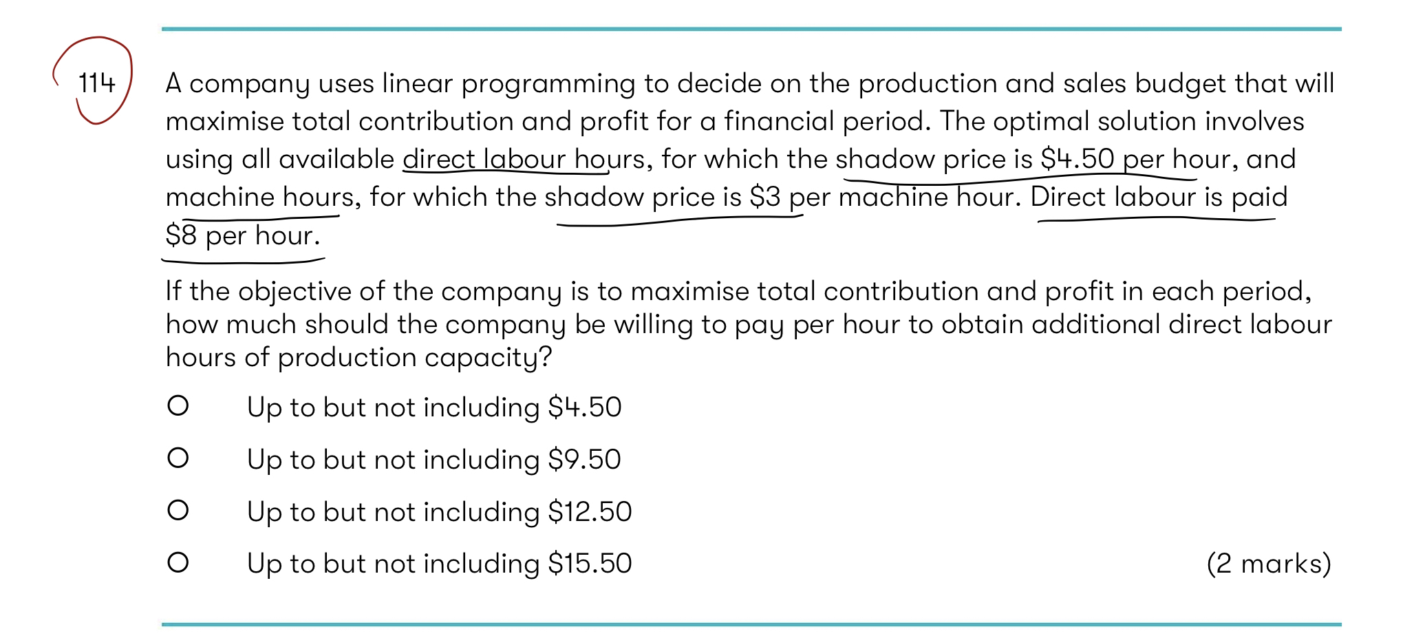同学,shadow price就是我们愿意多花的价格,那么原本direct labour cost是8,愿意多花的钱是4.5,那么我们公司就是愿意最多花8+4.5=12.5去请labour的。