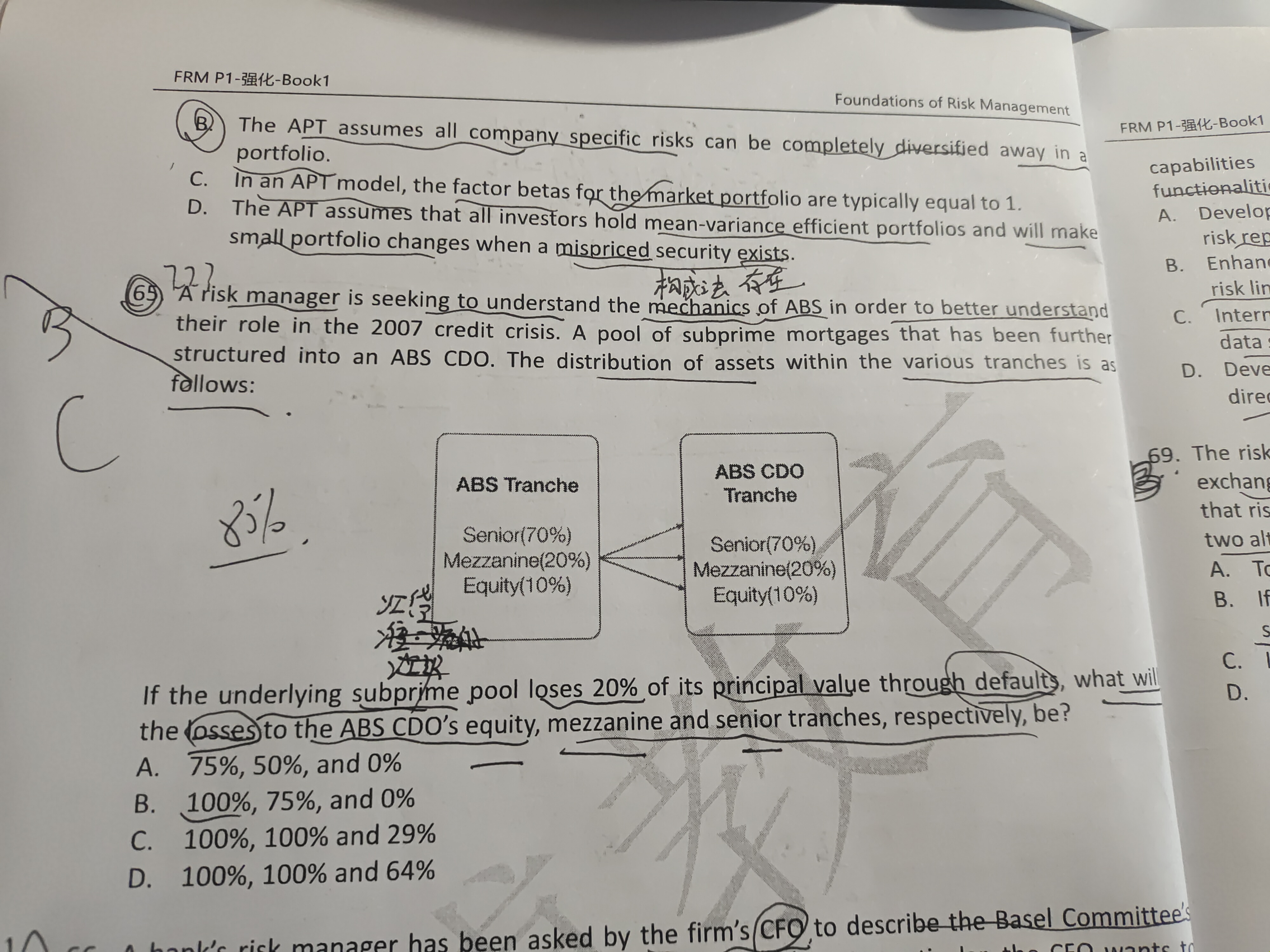 这里underlying subprime pool loses损失了20%,因为ABS CDO Tranche是将ABS Tranche中的 mezzanine的20%重新又分成了三种情况equity,mezzanine 以及senior三层,相当于原有的ABS Tranche中的equity的10%损失完后。需要将mezzanine重新按照承担损失的顺序承担剩余 10%(20%-10%)损失。通过计算 20%*10%=2%,Equity 100%全部损失。 20%*20%=4%,Mezzanine 100%全部损失。 剩下的senior来承担 (10%-2%-4%=4%)。senior层总共占的比重是 20%*70%=14% 所以它损失的比率就是 4%/14%=29%。