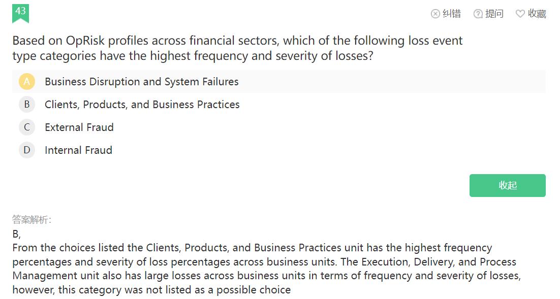 同学,这是关于操作风险分类的知识点哈,题干问哪种损失事件类型的损失频率和严重程度最高,这个结论是需要记住的,客户、产品和业务实践部门的损失频率百分比和严重程度百分比在业务部门中最高,关于损失事件的分类我们了解分别对应的典型事件就可以了