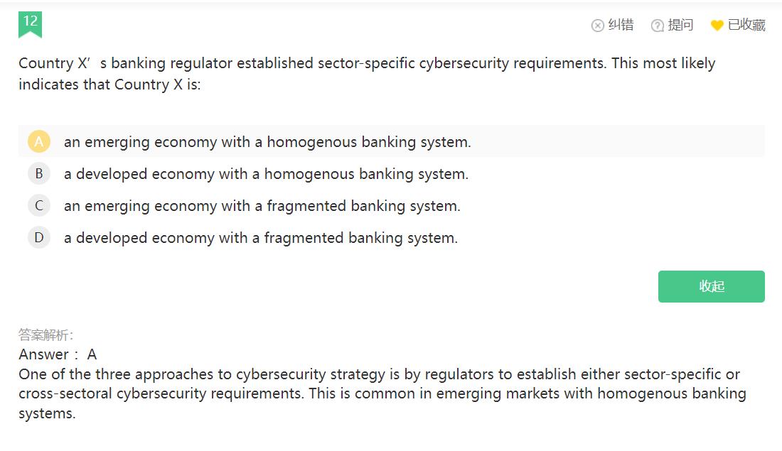 Qin同学,这个地方可以直接记忆哈,由监管机构制定特定部门或跨部门的网络安全要求,这在银行体系同质化的新兴市场很常见,根据题干的描述直接选A选项就可以了哈