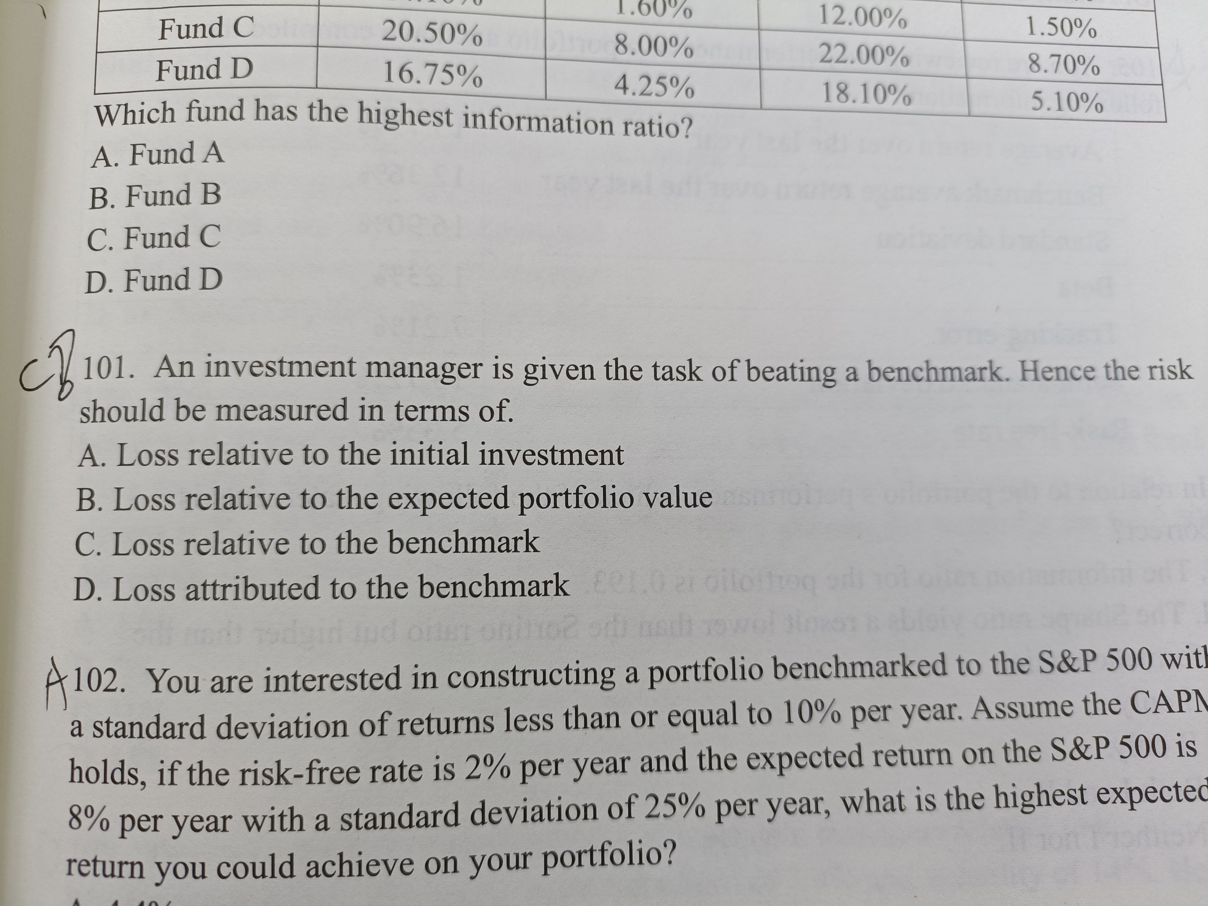 relative to是相对于的意思,attibute to是归因于的意思,ABCD意思分别是相对于初始投资的损失、相对于预期投资组合价值的损失、相对于基准的损失、归因于基准的损失,根据题干的描述,投资经理的任务是超越基准,因此,风险应根据相对于基准的损失来衡量