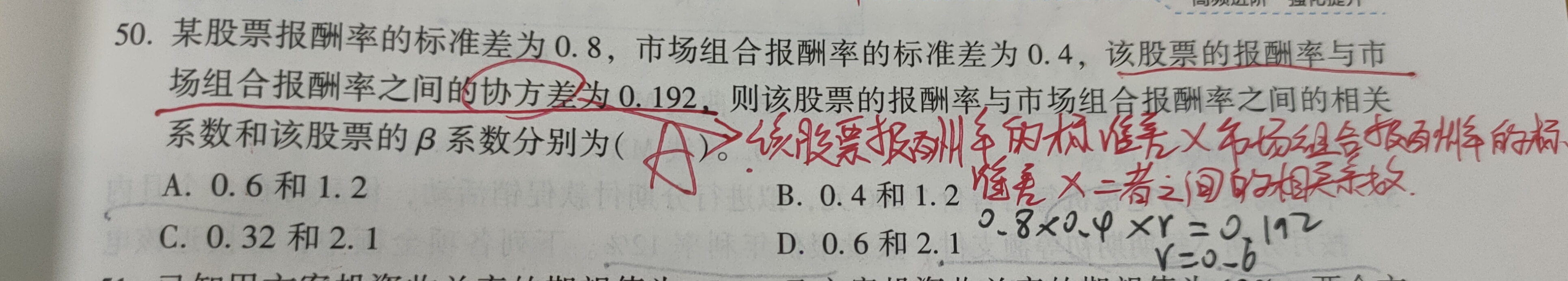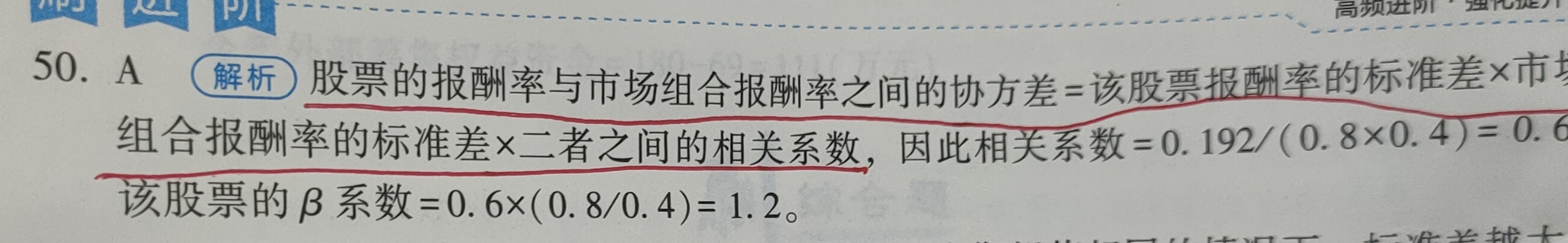 同学您好。βa=Cov(Ra,Rm)/σ²m 其中,βa是证券a的贝塔系数,Ra为证券a的收益率,Rm为市场收益率,Cov(Ra,Rm)是证券a的收益与市场收益的协方差,σ²m是市场收益的方差。 祝您学习愉快!