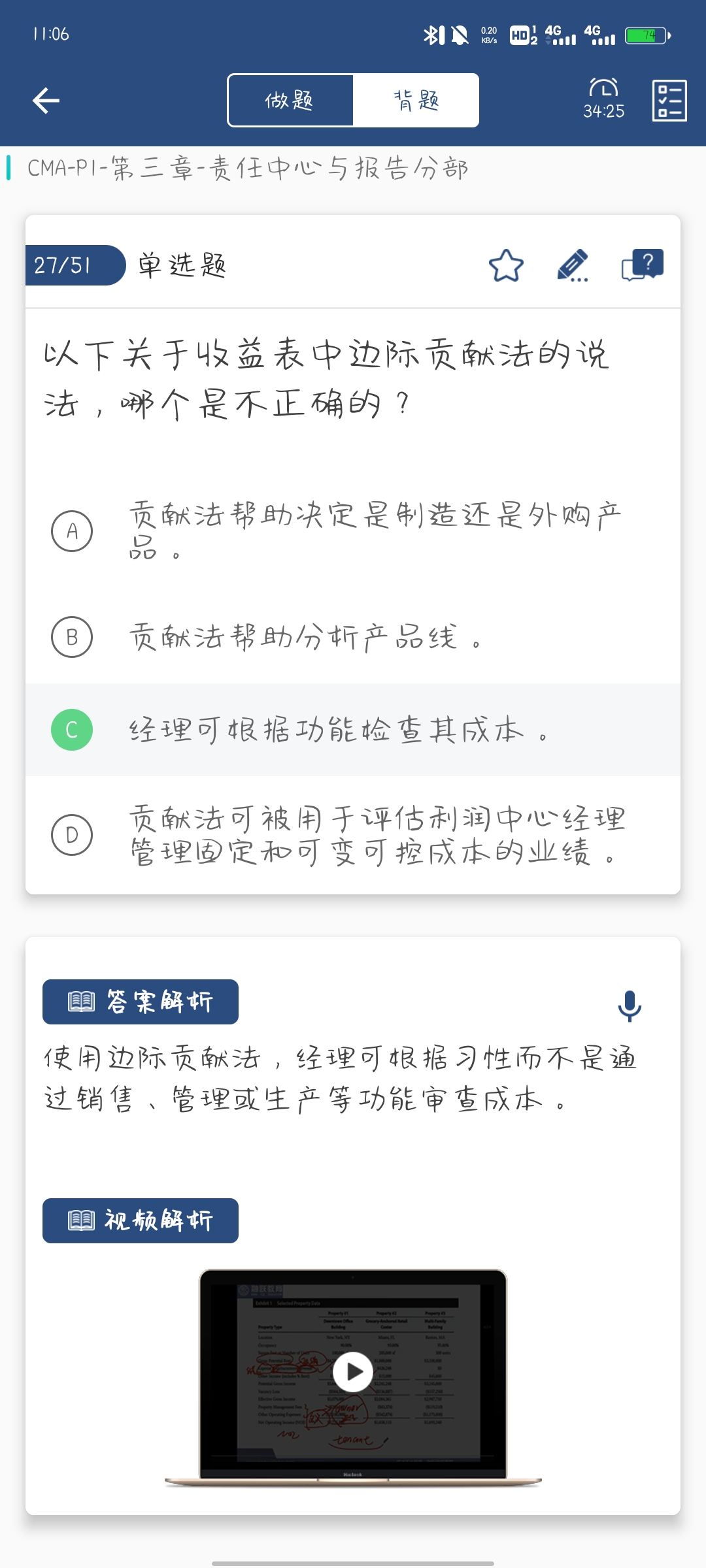 同学你好,衡量部门经理的指标是部门边际贡献减去部门可控的固定成本。“贡献法可被用于评估利润中心经理管理固定和可变可控成本的业绩”,题干中的意思就是,利润中心经理可以控制的成本,这句话可能是因为翻译问题,所以题目有点拗口。而选项C中,“经理可根据功能检查其成本”,边际贡献与功能不相关。