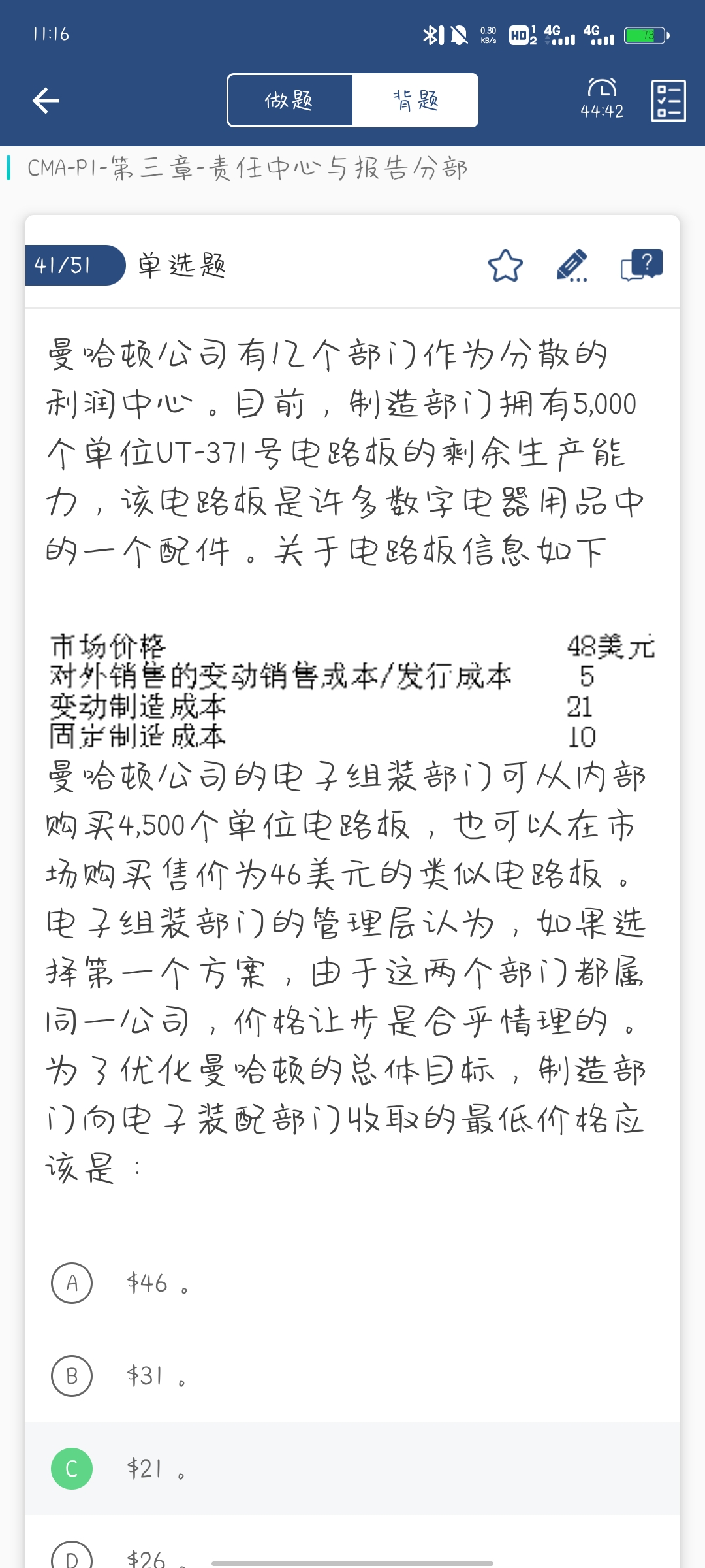同学你好,因为制造部门拥有5,000个单位UT-371号电路板的剩余生产能力,而电子组装部门需要购买4,500个单位电路板,所以内部生产是最划算的。所以这个转移定价大于变动成本就行,即最低为变动制造成本21元。因为是一个公司不同部门之间的物品转移,所以不需要考虑对外销售的变动成本。对外销售的变动成本在面对市场销售的时候需要考虑。