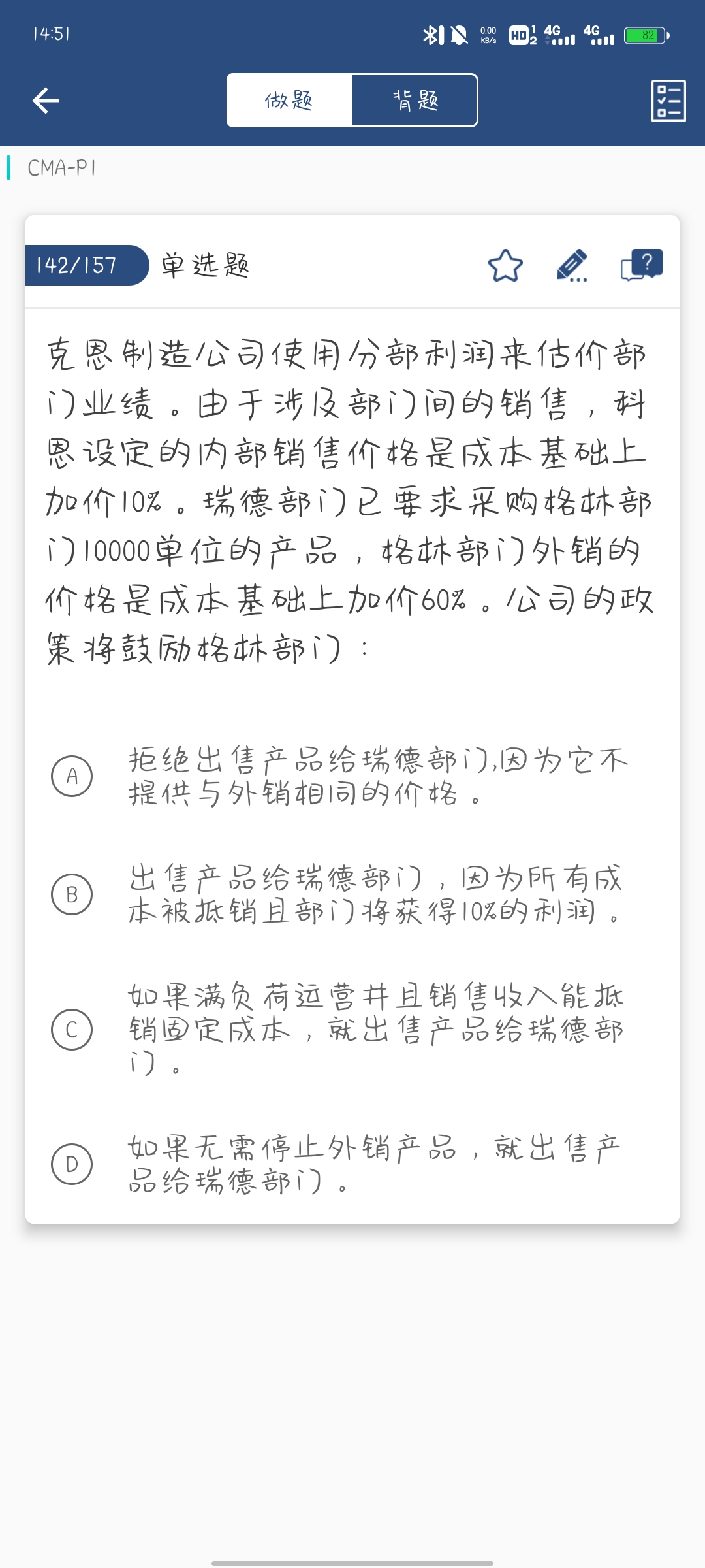 同学你好,因为外销的价格是成本基础上加价60%,而内部销售价格是成本基础上加价10%,外销价格是大于内销价格的,如果外部市场有需求,外销是可以比出售产品给瑞德部门获得更高的利润。所以应该先确定是否有外销需求,没有外销需求后,内销才相对划算。