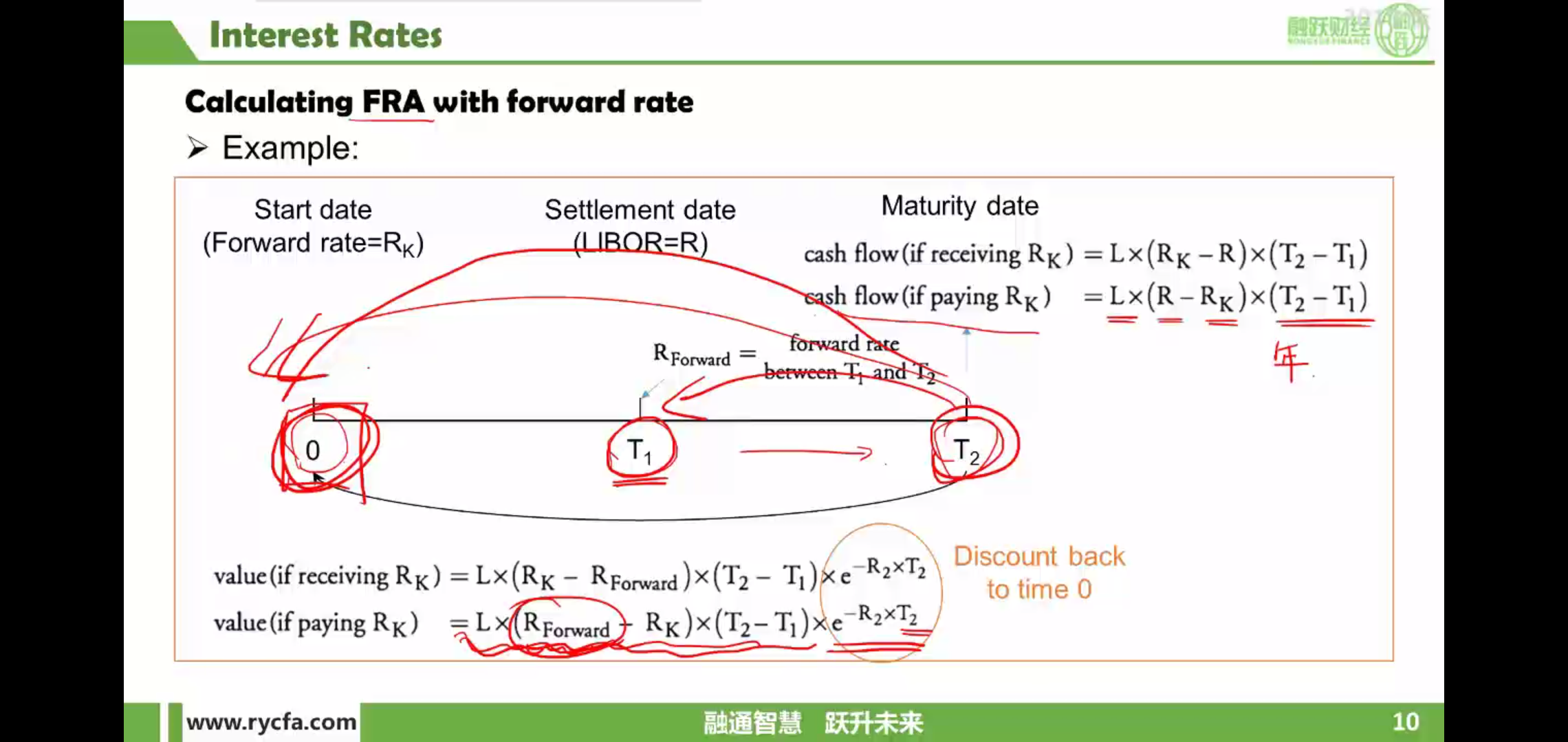 你的第一个问题,我没明白你在问什么。 第二个问题,FRA中约定的是在t1和t2之间的利率,这个协议约定了之后,采用的是netting的方式结算,就是收到的利率和支付出去的利率的差额,这个利率的差额乘以面值再乘以时间,就是你所能收到的现金流。这跟你放在银行的存款利率乘以你的钱数乘以你放在银行的时间,算出你能得到的利息是一样的,但是收到的利息要减去支出去的利息。