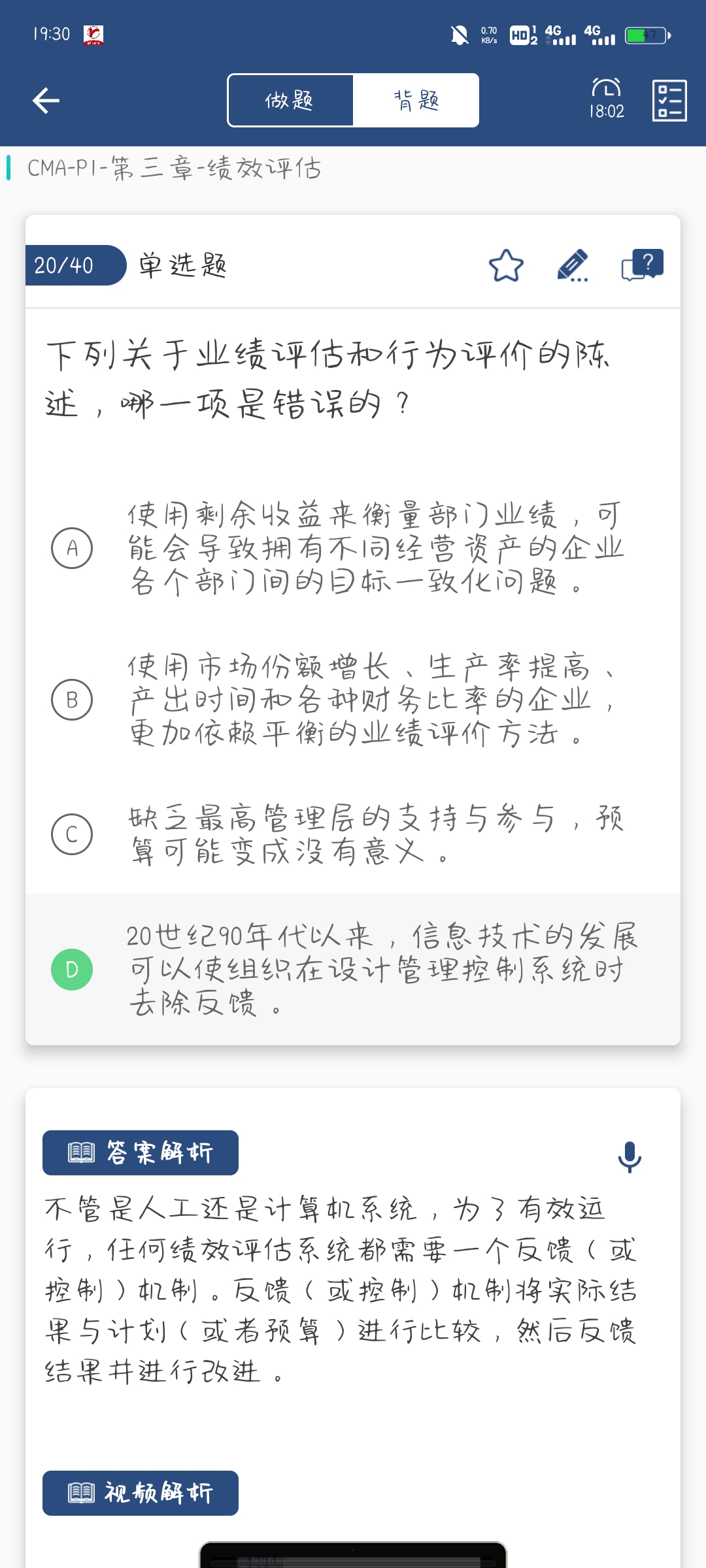 a选项意思是使用剩余收益会促进目标一致化。但我们需要注意剩余收益有一个确认,因为数据是数值化的,不便于不同规模的公司和部门的业绩比较。