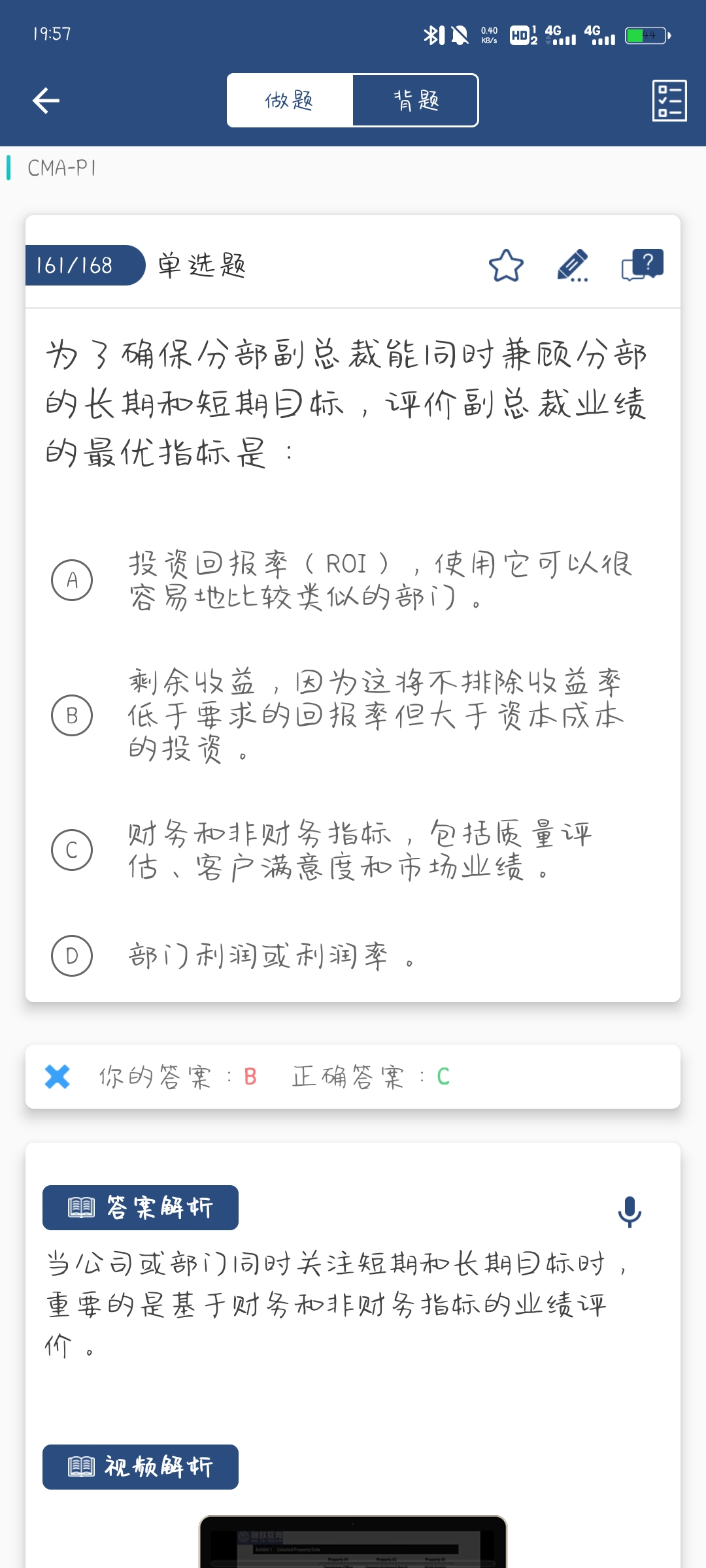 同学你好,剩余收益RI存在一些缺点,增加剩余收益为目标涉及最大化利润,销售收入最大化的同时成本最小化,而管理层可能会考虑那些短期内最有可能被消减的酌定成本。比如:研发成本、质量控制成本、广告和促销成本、不更换旧资产等情况,这些行为往往会带来长期问题。而题干中描述“为了确保分部副总裁能同时兼顾分部的长期和短期目标”,所以选择剩余收益不恰当。