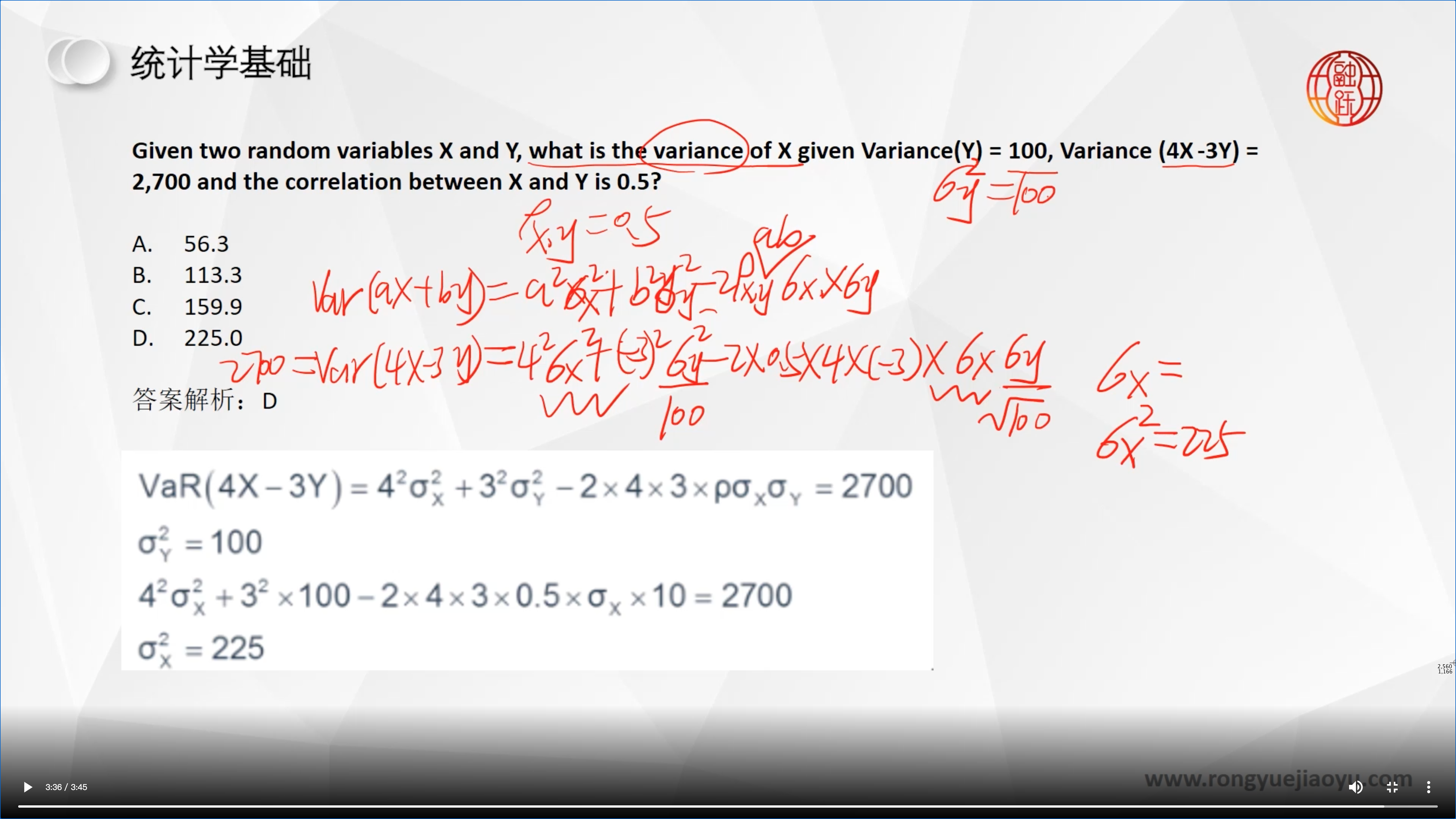 同学,225是按照倒数第二行的列式得到的哈,老师讲解有问题,应该是减去3的,按照解析即可哈