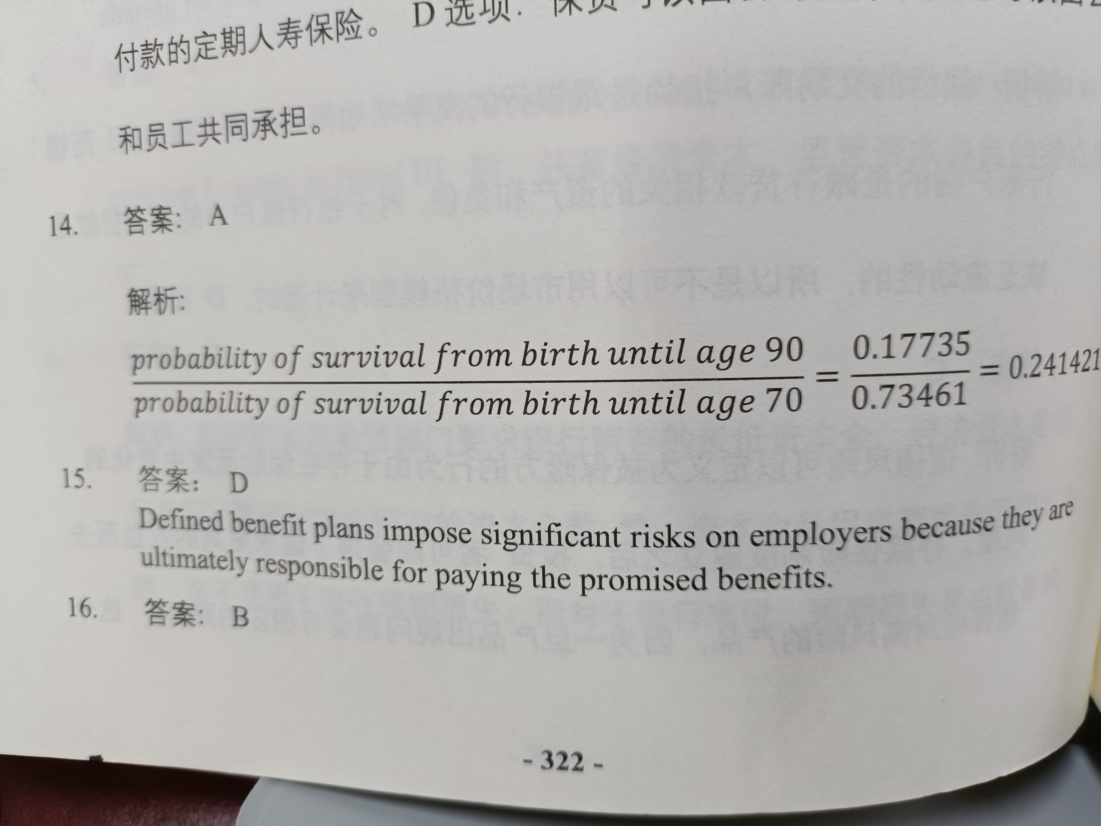 第一列是该年龄一年内死亡的概率,所以70岁到90岁是在71.72....89岁未死亡的基础上在90死亡的概率,所以是乘积,而不是答案中给出的那样。答案的是0岁的人活到90岁的概率除以0岁的人活到90岁的概率,不是70,条件弄错了。