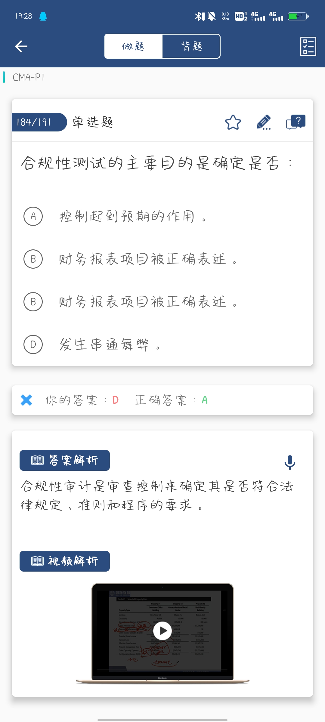 (1)同学你好,合规性测试(符合性测试)是通过追踪、实验、观察等方法来确定内部控制制度的设计和执行是否有效而实施的审计程序。也就是选项A中写的控制起到预期的作用。(2)如果你把题干和D选项连起来以后,合规性测试的主要目的是确定是否发生串通舞弊,这样是不是会发现D选项缩小了合规性的目的范围。