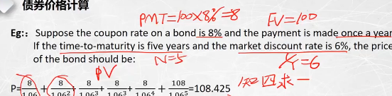 利息8+本金100=108,折现五年到0时刻