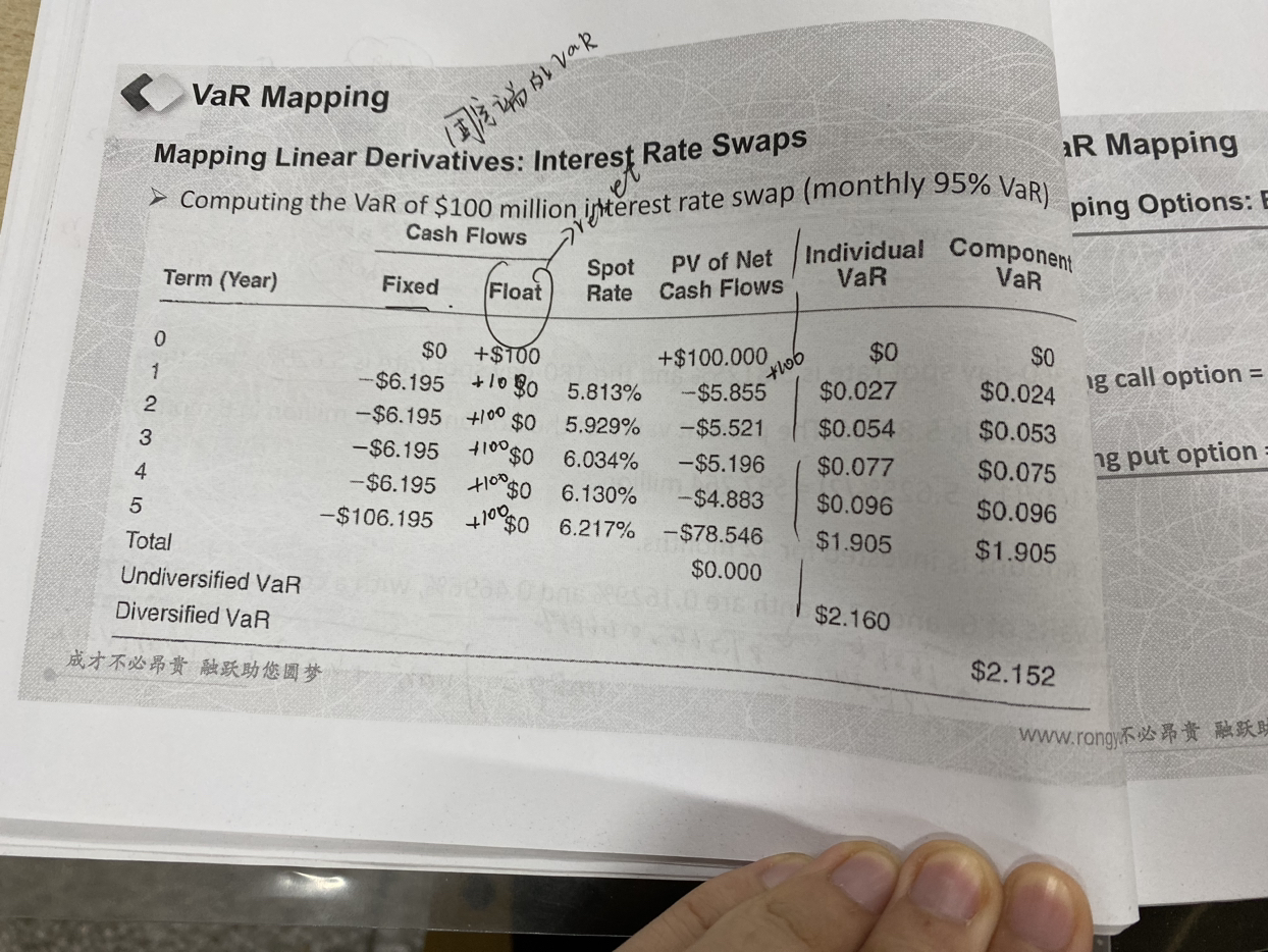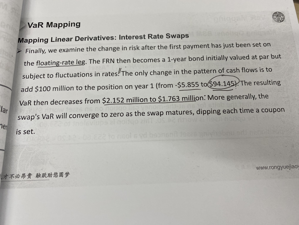 同学,是因为在浮动端考虑了现金流的影响,也就使得原来为0的浮动端变为100的现金流,从而在计算净现金流的现值时,由负变正,对VAR的影响就是降低哈,这个内在的原因了解即可