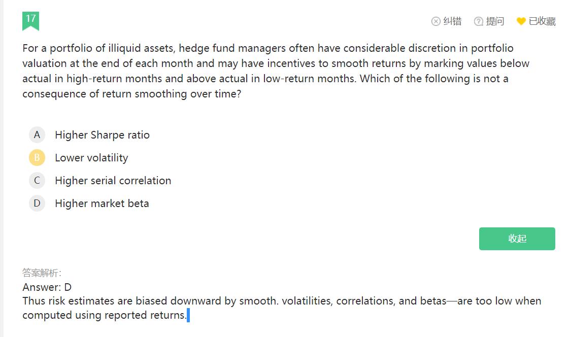 Qin同学,这里考查的是非流动性资产在平滑收益后的特征哈,简单来说就是平滑收益后,收益变高风险变低,所以D选项说beta更高是错误的说法哈