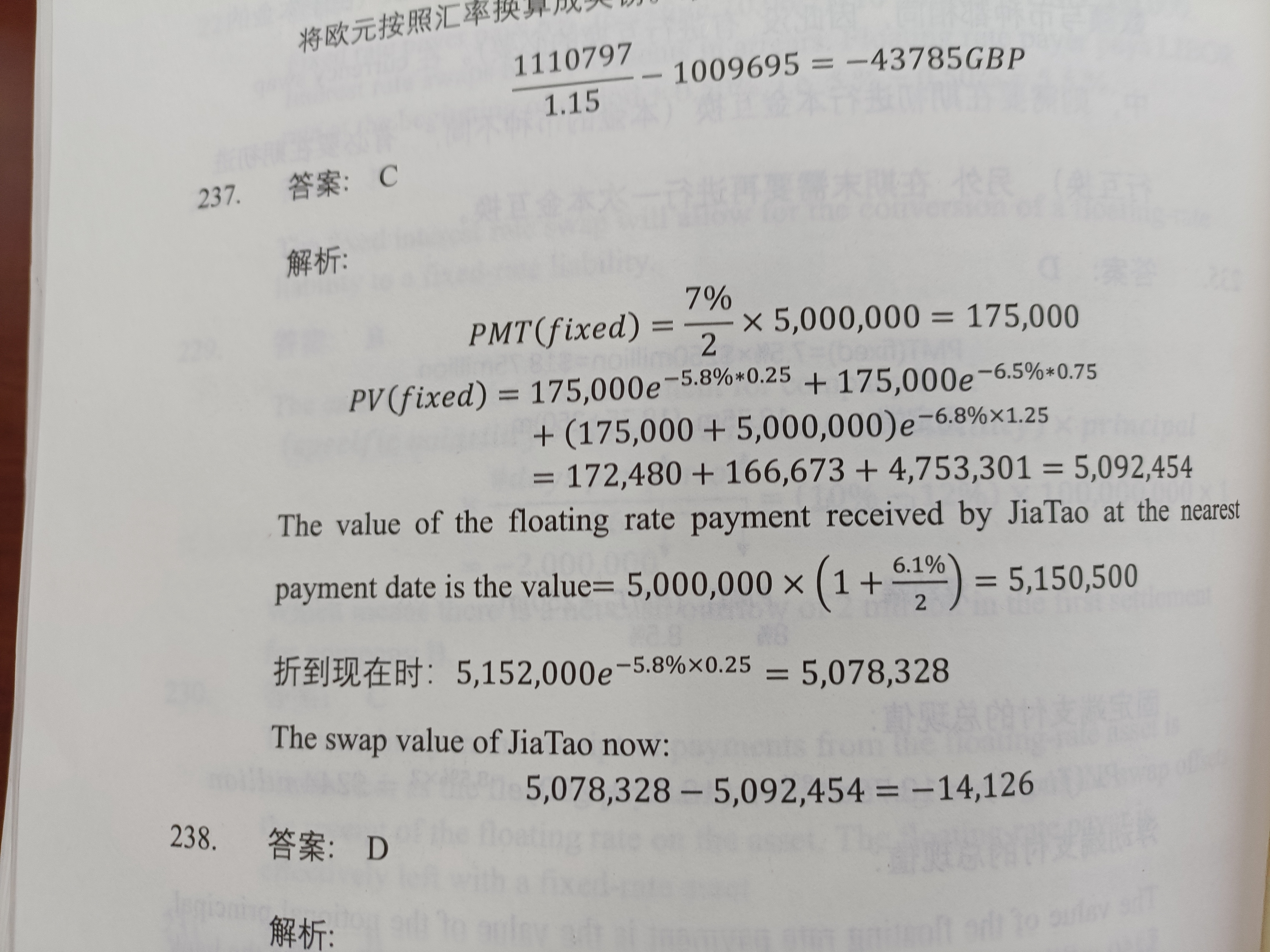 正是基于这个结论,我们可以解决大部分类似题目,但在这道题目中,不是恰好处于付息日,而是处于上一付息日与下一付息日之间,所以要采用现金流折现的算法,依据浮息债的特殊性质,现金流只需贴现下一期即可,利率在上一期已确定为6.1%,即可列出浮动端的式子了