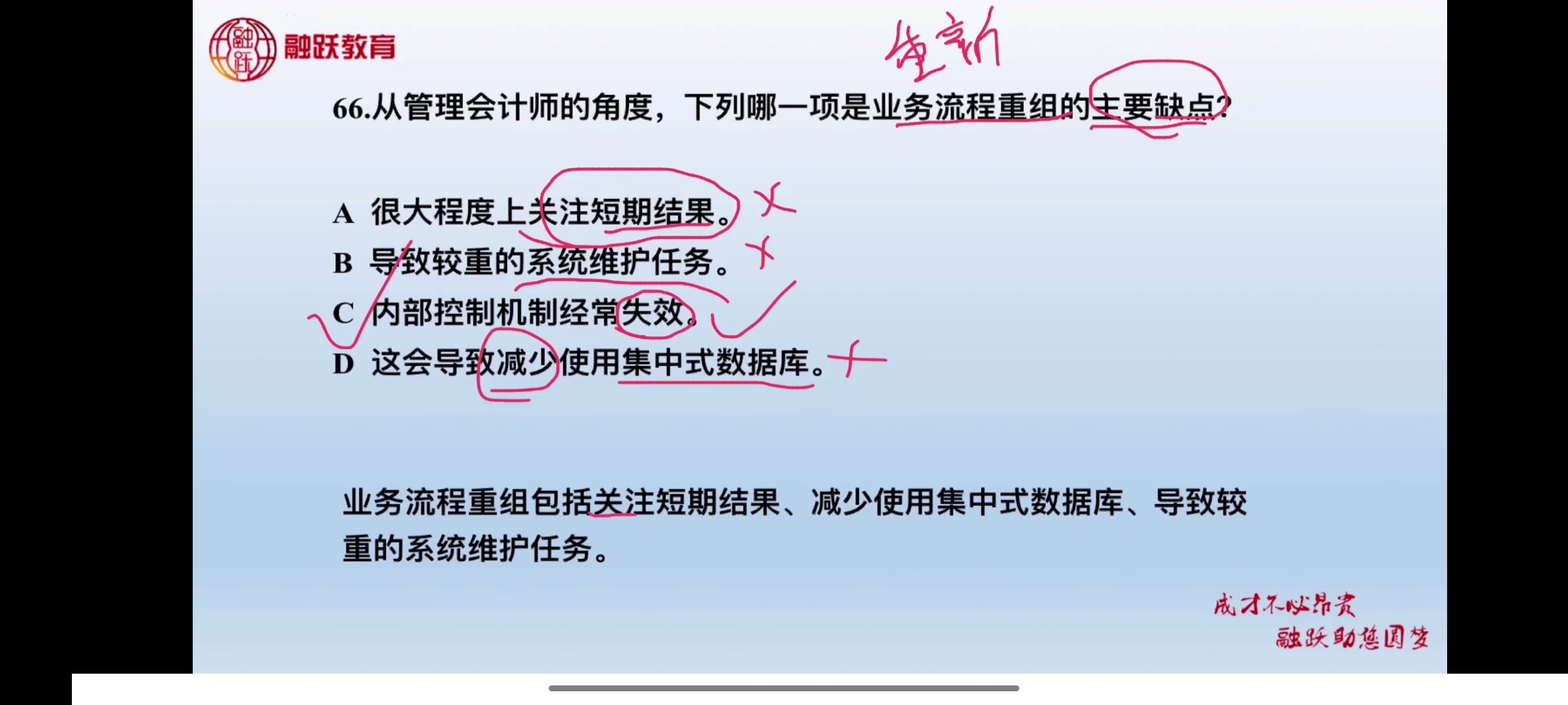 同学你好,我理解的是题干中问的是主要缺点,业务流程重组造成内控制度经常被调整,会造成B和C,都属于缺点,只是内控影响比较大,所以是主要缺点。
