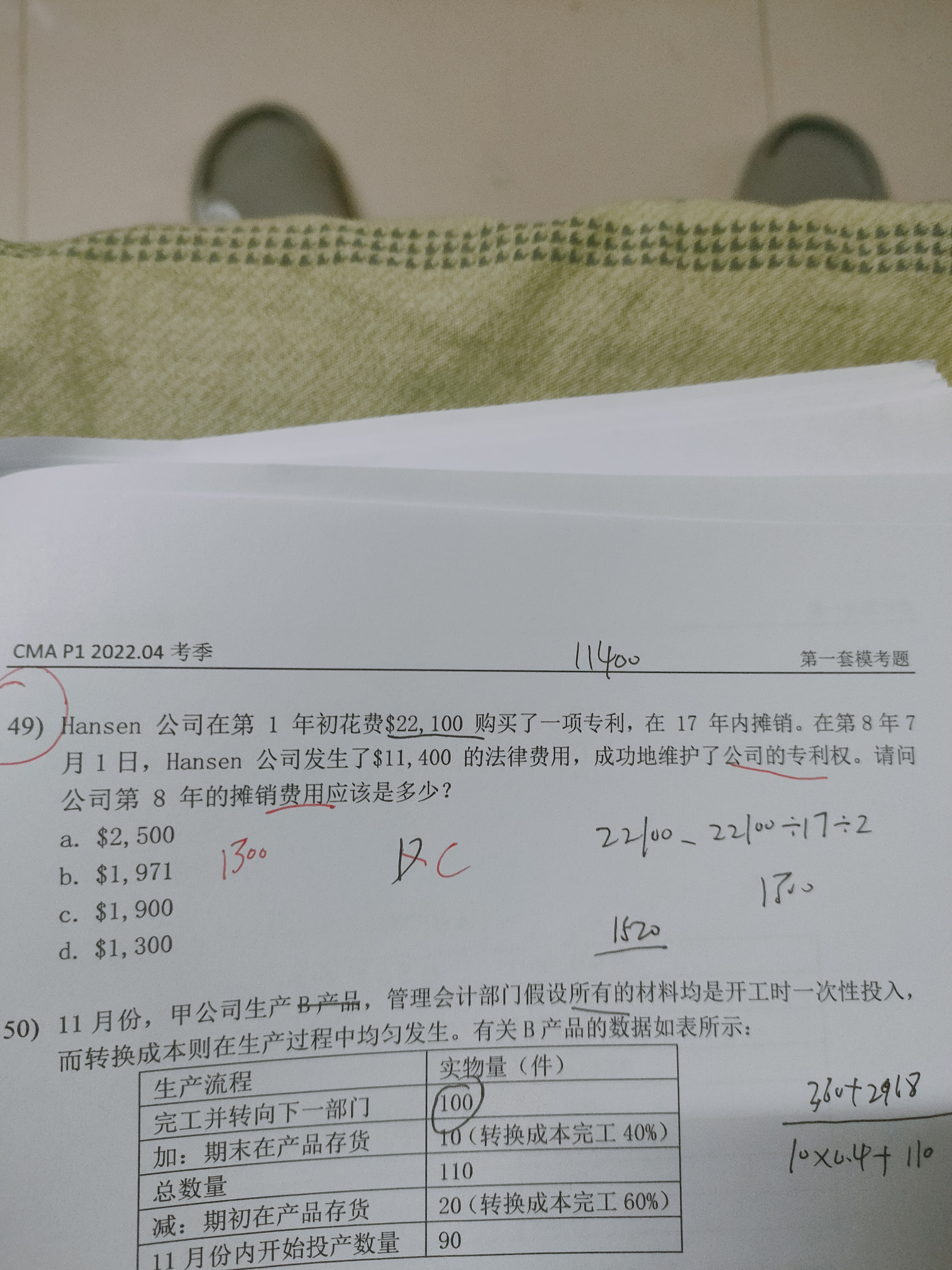 第8年6月30日的时候,无形资产账面原值=22100,累计摊销=9750,账面价值=12350。7月发生法律维护费,所以重新计算原值=原先的账面价值+新发生的维护费=12350+11400=23750。尚需摊销月份=114个月(还剩9年6个月),7月-12月需摊销月份6个月,所以(12350+11400)/114×6=1250。