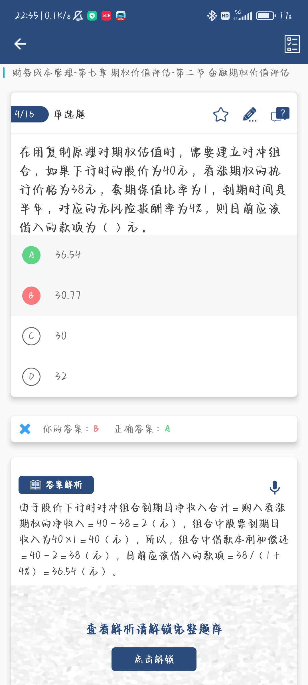 同学您好。复制组合原理本质是构建一个股票与借款组合,该组合现金流量等于期权现金流量,所以需要确定购买股票的数量及套期保值比率。 套期保值比率H=(Cu-Cd)/(Su-Sd),本题中已经给出该比率=1。借款数额B=(H*Sd-Cd)/(1+r)。代入此公式求答案即可,公式里的Sd、Su利用题干给的信息去求,无风险报酬率为4%是已知条件。这类题目不难,重要的是公式的运用,不用着急多做几道类似题目就好了。感谢您的提问。