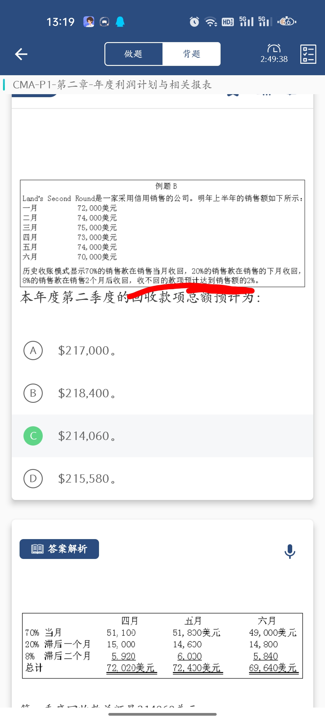 同学你好,关于收款比例题目中给的信息是销售额的70%当月收回、20%次月收回、8%再次月收回,2%收不回,相加比例总共100%。当期收回的比例直接跟整体销售额相比就行。所以四月能收回的现金是:70%的4月+20%的3月+8%的2月。五月能收回的现金是:70%的五月+20%的四月+8%的三月。六月能收回的现金是:70%的六月+20%的五月+8%的四月。合计214060。