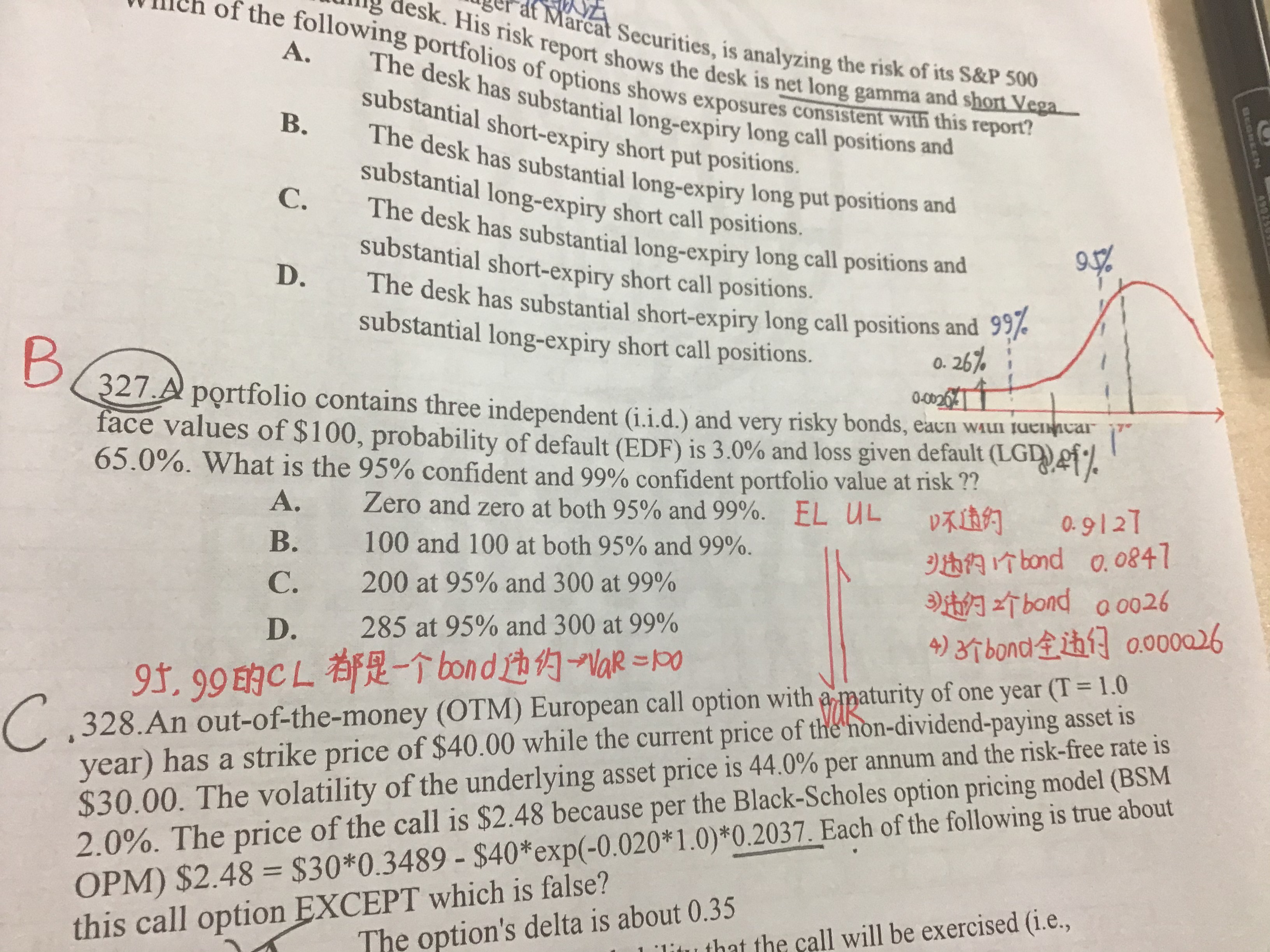 那个所谓的正态分布曲线其实就以概率为纵轴,以损失额为横轴所画的一个图,将损失从左到右从大到小进行排序,左边的5%处。右边的95%处,所对应的损失额就是95%的var.左边的1%处。右边的99%处,所对应的损失额就是99%的var.可以看到两个都是100.,这是根据你写的那些红色的式子算出来概率对应的。 一个bond的价值是100啊,题干的第二行的逗号前面写有。