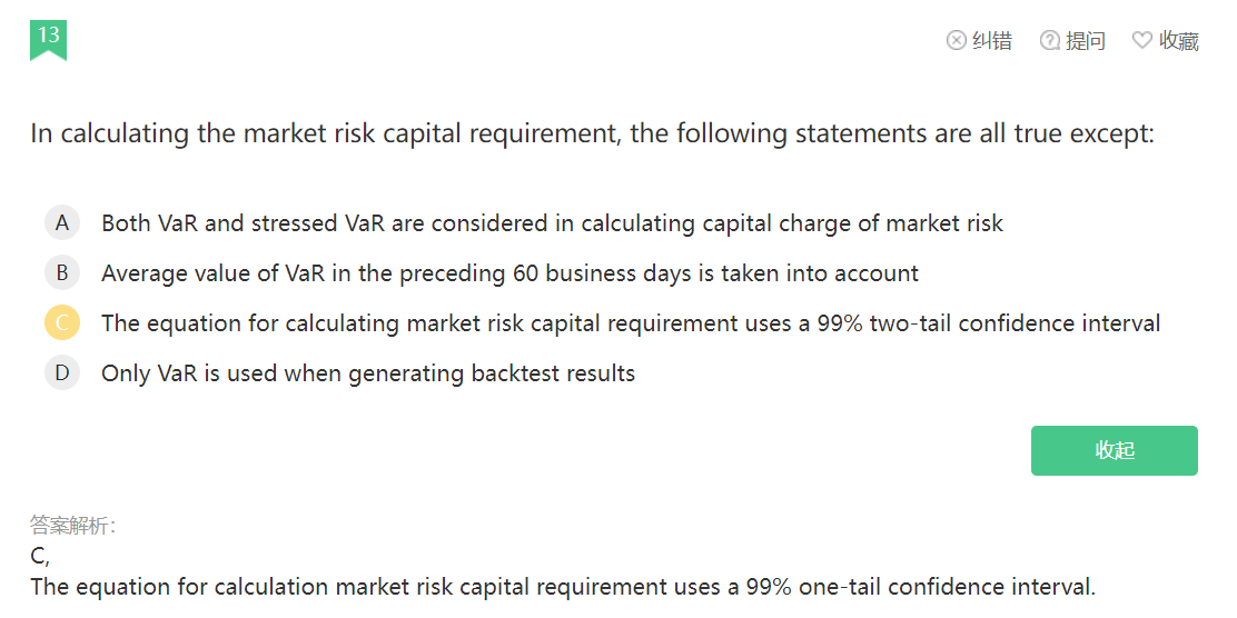 Qin同学,VAR值计算都是单尾哈,巴塞尔那一部分基本上都是关于VAR值的要求,所以如果遇到VAR的要求都是单尾哈,双尾的话二级确实少见,很少遇到