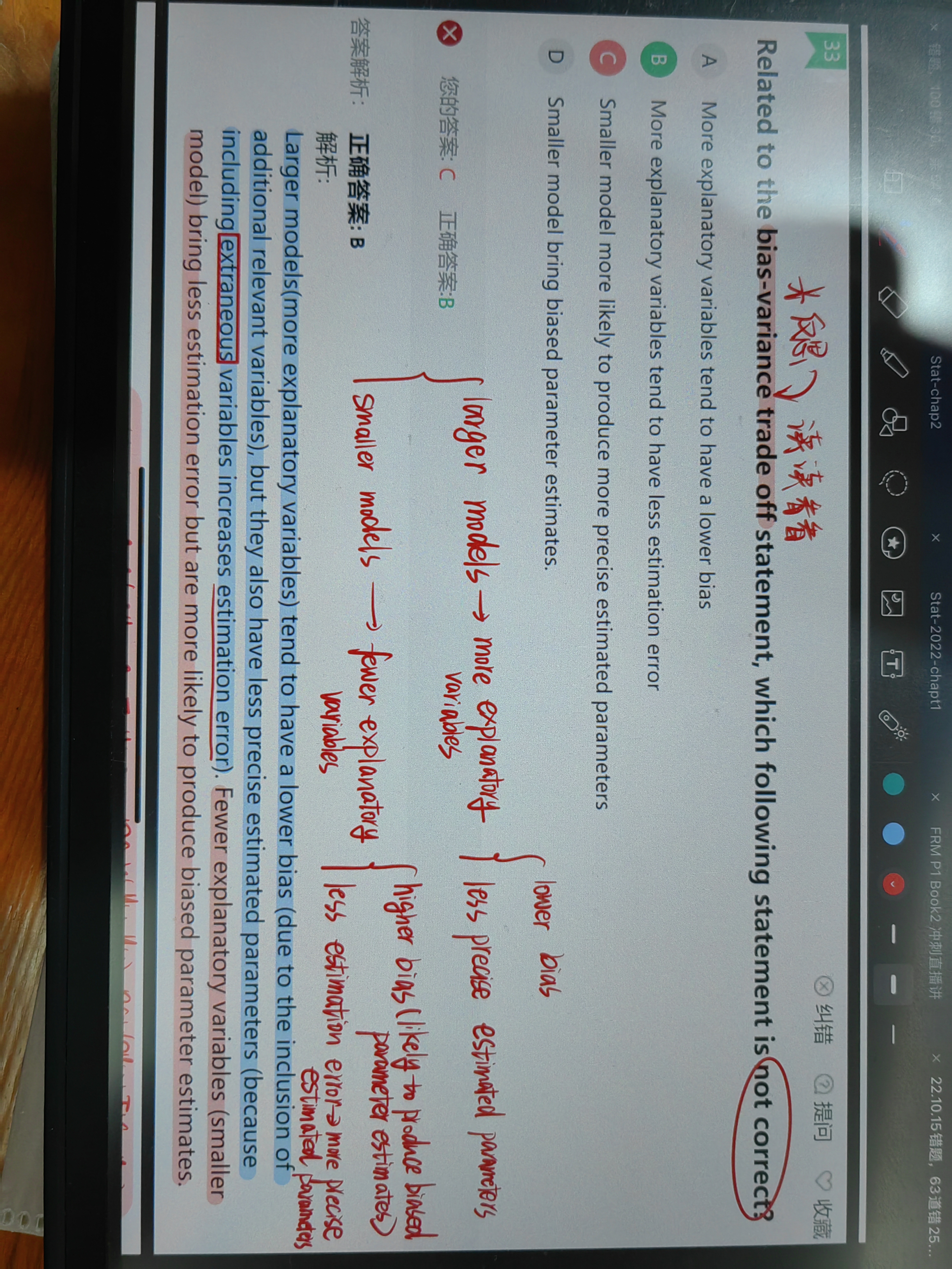 所以,老师的意思是,在样本外拟合得好会导致bias大。 33题中A指自变量多的模型会有更高的bias error是正确的;但是一般而言自变量多的模型bias低且参数(估计量?)方差大,参数不精确。 这是不是是因为33题中,若是自变量多到overfit的程度,反而会导致样本外拟合增大,反而使得bias增加?