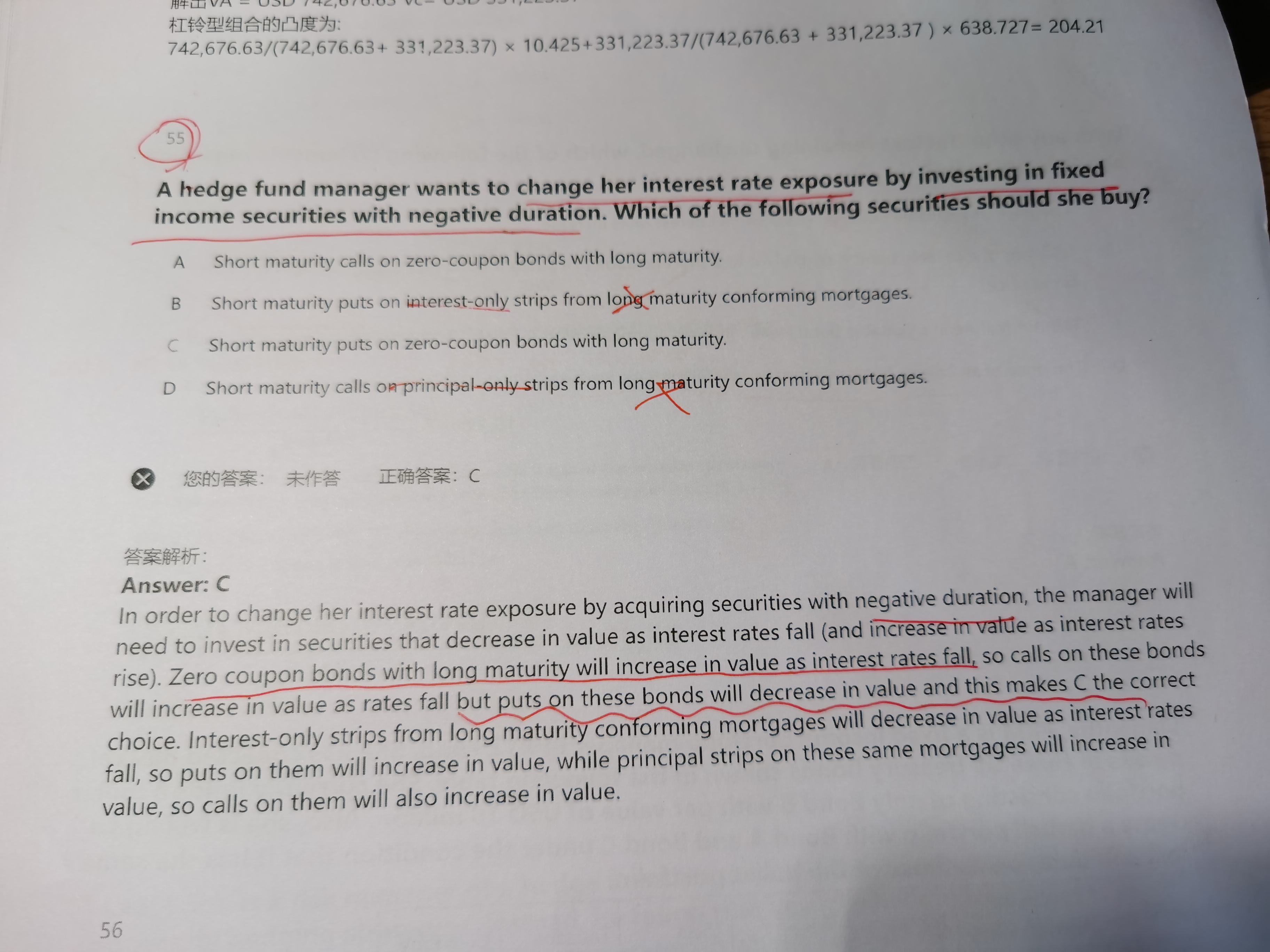 这句话的意思是说当利率下降时,零息债价格会上涨,但此时又加了一个看跌期权,即标的资产零息债价格上涨,但是此时看跌期权的持有方就会亏损,所以看跌期权的价格就会下跌,所以就会产生负久期的效果,即持有的资产价格跟利率成正比。