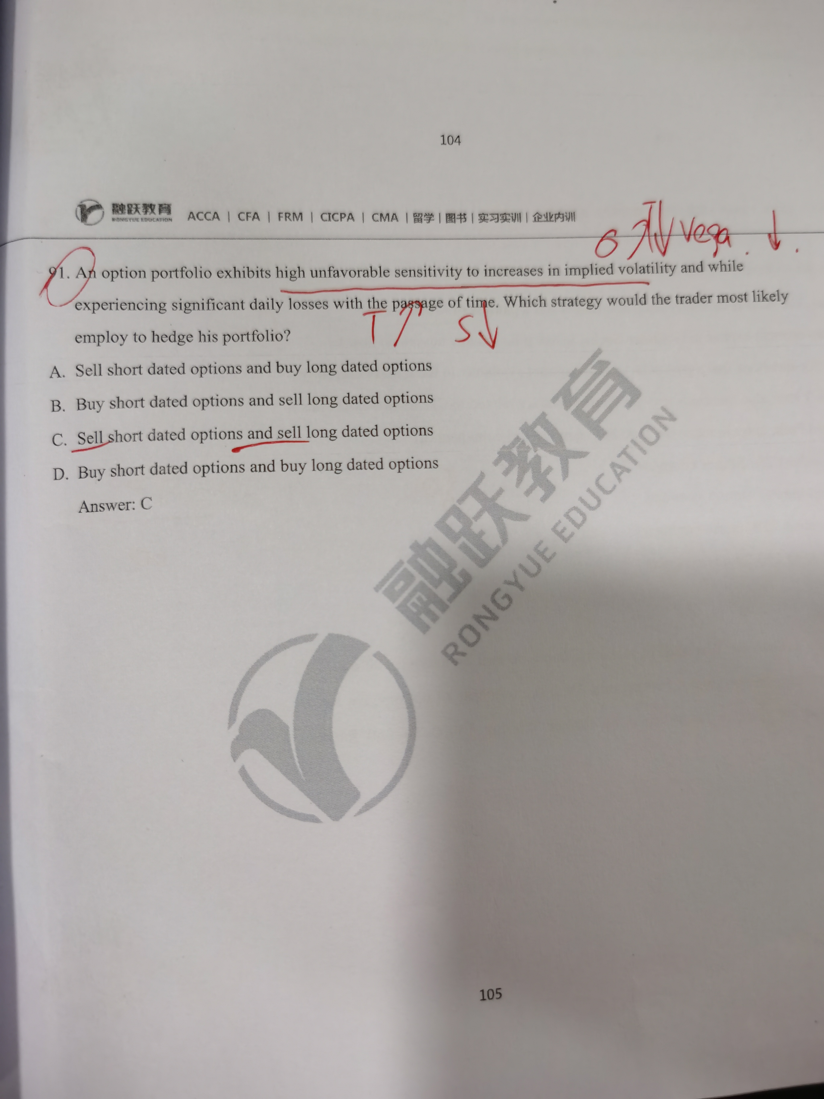 根据题意,目前的期权组合里面是—vega(vega与波动率负相关,随着波动率的增加,期权的价值上升,对期权的多头时有利的)和-theta(theta与流逝掉的时间负相关,随着时间的流逝会降低期权的价值,对于期权的多头是一个损失) , 要想达到对冲的目的,需要有一个+vega和+theta的组合, 因为vega与期限成正比,所以长期限的期权vega比短期限的期权vega更大,所以长期限的期权vega用++表示,短期限的期权vega用+表示, 同理,因为theta与期限成反比,所以长期限的theta比短期限的theta更小,长期限的theta用-表示,短期限的theta用--表示, 这样买入一个长期限的期权就相当于买入一个长期限的vega用+(++)表示,买入一个长期限的theta就用+(-)表示, 卖出一个短期限的期权就相当于卖出一个短期限的vega就用-(+)表示,卖出一个短期限就用-(- -), 最后,买入一个长期限的期权+卖出一个短期限的期权的期权组合就相当于vega为【+(++)-(+)=+(+)】,theta为【+(-)-(- -)=+(+)】的组合, 这样就可以达到对冲的目的。