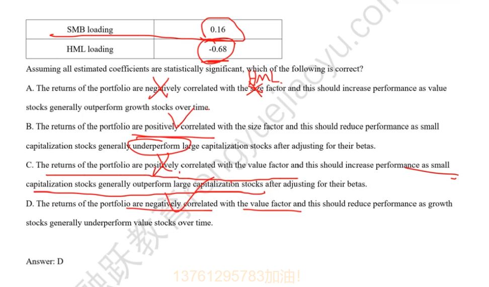 B选项意思是投资组合的回报率与规模因素呈正相关,这应该会降低业绩,因为小盘股在调整贝塔后通常表现不如大盘股,错误,小盘股表现优于大盘