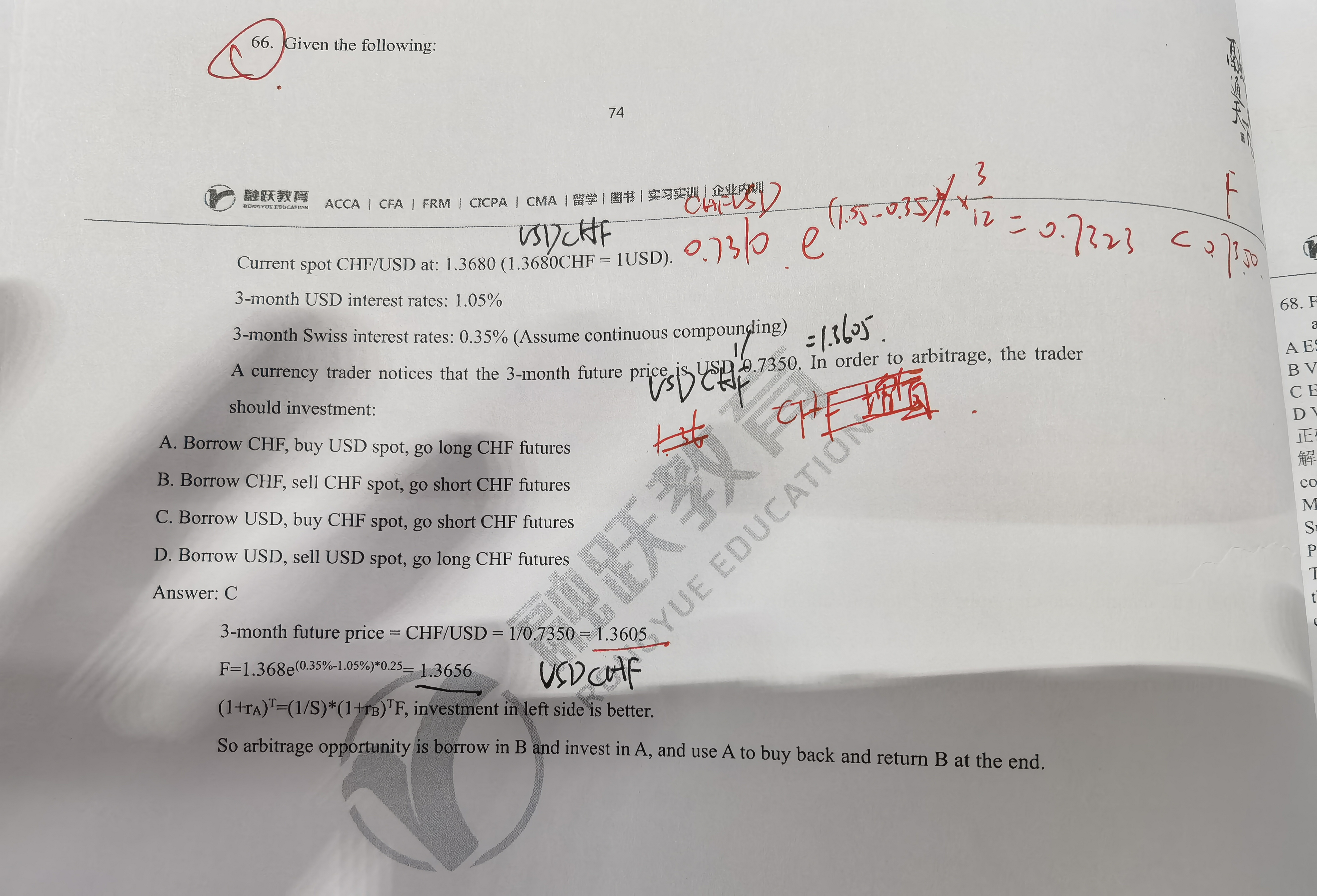 在A/B的报价形式中,我们有一条这样的公式,即:forward rate = spot rate * e[(rA-rB)*t],公式成立的背景就是无套利定价。回到公式的本质,假设,你现在将手里一单位的B货币,按A/B的即期汇率报价形式,换成A货币(即:1*sopt rate),换算成A货币后,在A国进行投资,投资期限为t [即:1*spot rate*e^(rA*t)],那么投资完了以后,你还要按A/B的形式,将货币换位B货币,即[1*spot rate*e^(rA*t)]/forward rate。根据无套利定价原理,他的收益应该等于直接用一单位B货币在B国投资相应的期限,即:1*e^(rB*t)。最终得到的等式为:1*spot rate*e^(rA*t)]/forward rate=1*e^(rB*t),经过变形以后得到我们最终求forward rate的等式,但是如果你想做有关套利的判断,你不要去变形整合,举个例子,在变形之前左边对应换外币,在国外投资,在换回本币的过程,右边对应直接在本国投资的过程,那么你通过左边和右边的大小比较来判断你应该做多左边做空右边,还是做空左边做多右边。以这个题目为例,你按照这个方法算一下等式左边和右边的数值,算完的结果应该左边大于右边,也就是将美元换瑞士法郎,在瑞士投资,再换回美元,这个收益要大于直接用美元再美国投资,所以我们采取的操作应该时买现货(对应现在将美元换成瑞士法郎),卖期货(对应未来将瑞士法郎换成美元)。同时根据无套利的原则,要实现净投入为0,即我们现在绝对做多等式左侧,那么做多的资金不能自己出,否则不满足净投入为0,那么资金从何而来,通过做空等式右侧,即借入美元。 不要过于纠结具体的货币怎么买卖所对应的规律,要掌握公式的本质。