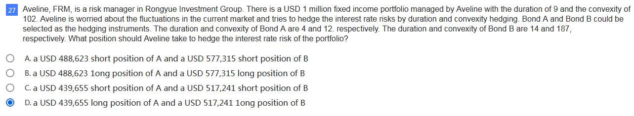 同学,根据题干的描述,是要用Bond A and Bond B作为对冲工具来对冲现有的头寸,分别给出了各自的久期和凸度,那么我们就可以将久期和凸度分别列式对冲,1,000,000 x 9+VA x 4+VB x 14=0;1,000,000 x 102 + VA x 12 + VB x 187 =0,解该方程组就可以得到对冲工具的数量了哈